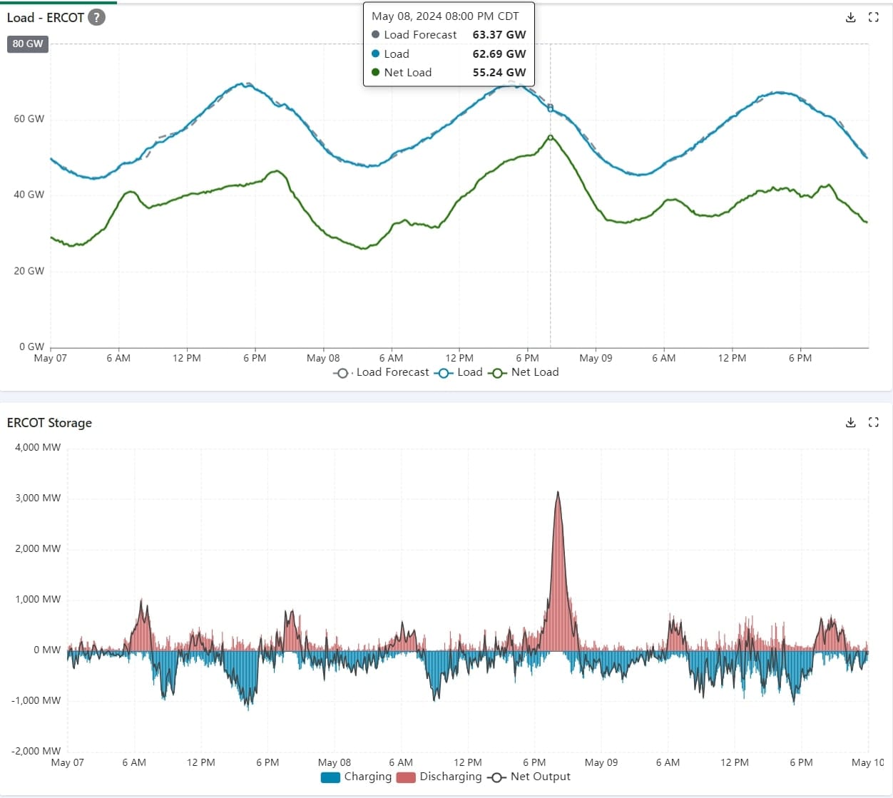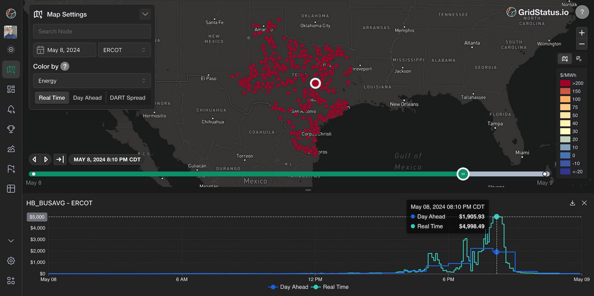 Energy costs can also swing the other direction. Let’s take a look at ERCOT for some extreme energy prices. On May 8th, ERCOT nearly hit their energy price offer cap of $5,000/MWh just after sunset, as net load was peaking.