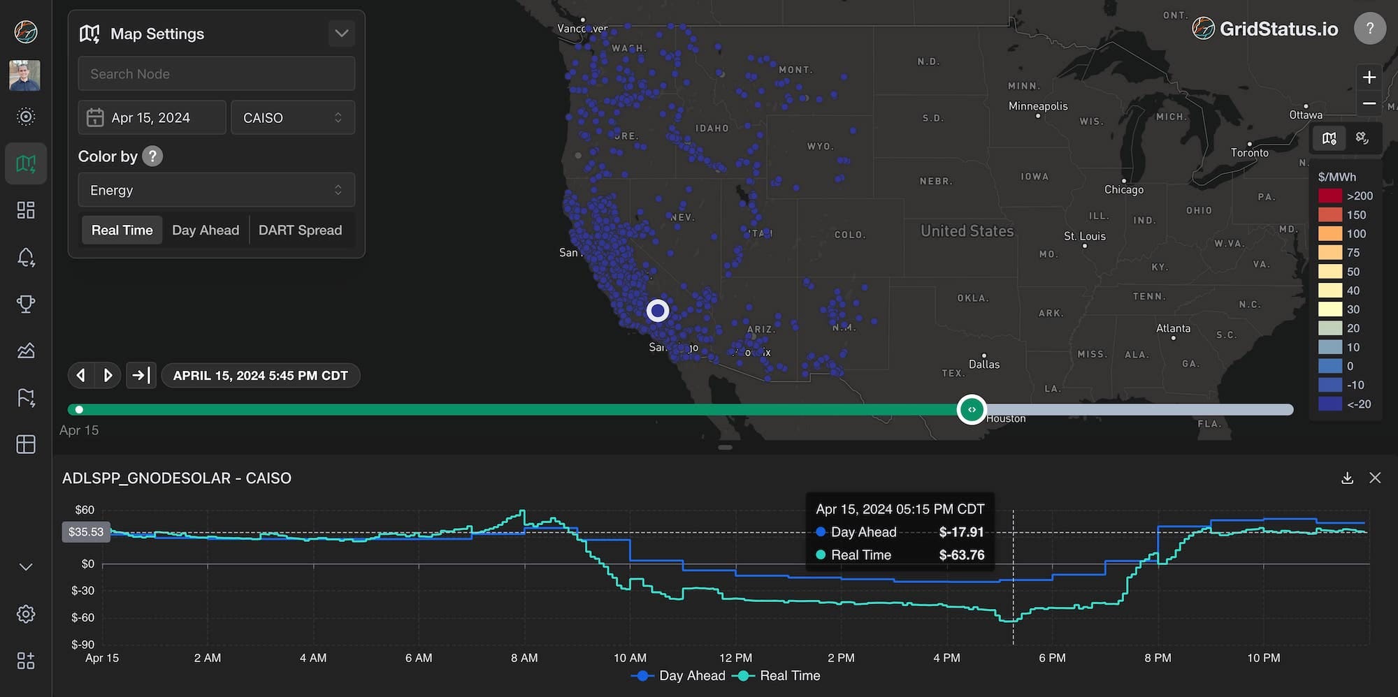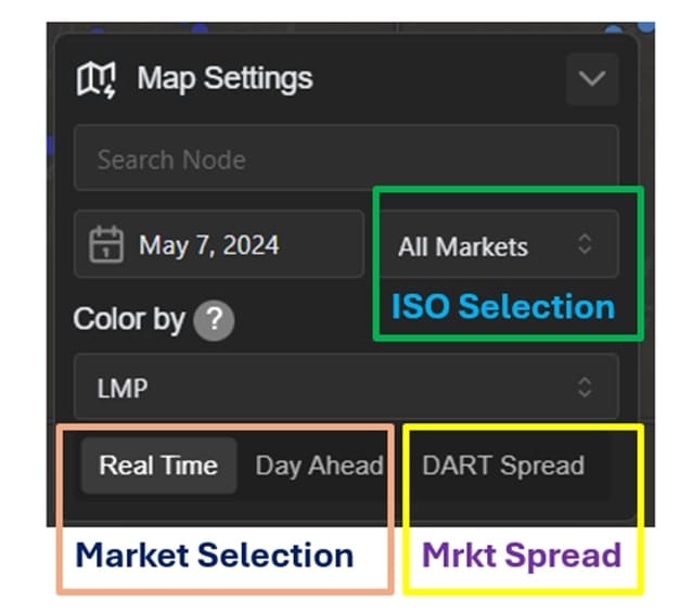 The bottom row of the settings panel allows for quickly swapping between day-ahead, real-time, and the DART Spread. DART is the subtraction of real-time prices from day-ahead for a particular node and moment in time. A larger spread is generally indicative of changing conditions during real-time or poor forecasts in the day-ahead.