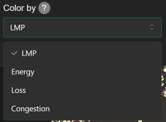 Most markets, with the notable exception of ERCOT, report three LMP components, which together equal the LMP. The map can be configured to color nodes by LMP or each of the components individually.