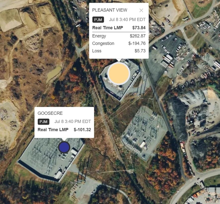 The two substations shown below, Goose Creek and Pleasant View, experience vastly different pricing due to the calculated impact of additional MWs at each location.