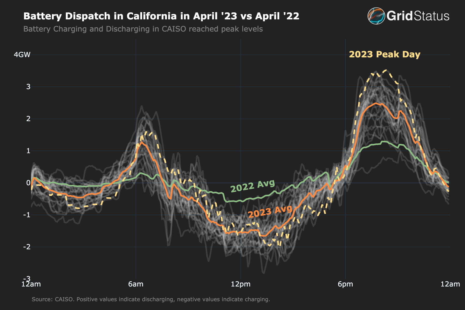 Natural gas ramping is also inconclusive, averaging slightly higher values in both 2021 and 2022, 5.4 and 5.3 GW, respectively, compared to 5.2 GW in 2023. This is partially explained by the rise of batteries - at 4PM they were consuming more than 300 MW, while at 9PM they were discharging 2GW - a 2.3 GW swing which was more than 150% greater than the same value for 2022.