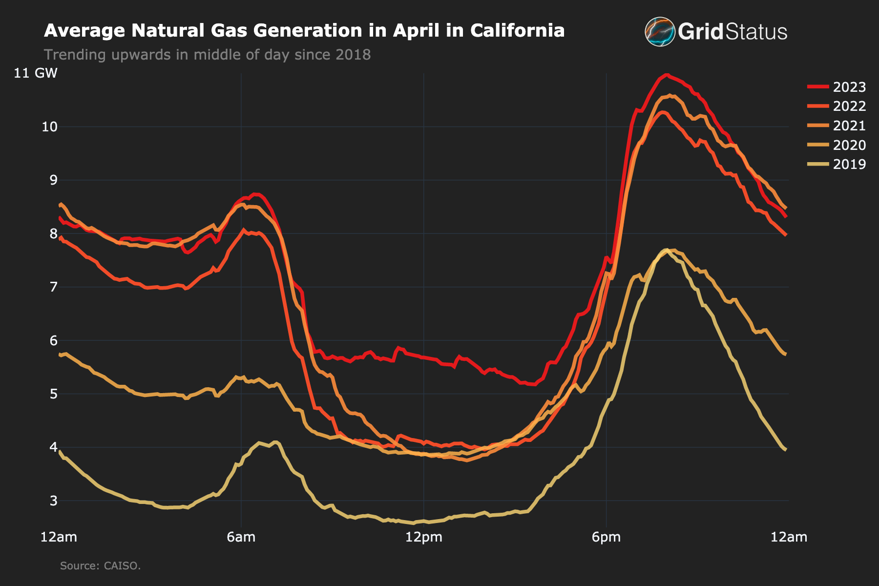 However, renewables and batteries weren’t the only resources setting records. Despite many years of very public effort and expense to reduce dependence on fossil fuels, natural gas generation saw its highest values in at least 6 years. While the total sum of generation from gas resources was not dramatically higher than some previous years, the midday hours increased substantially.