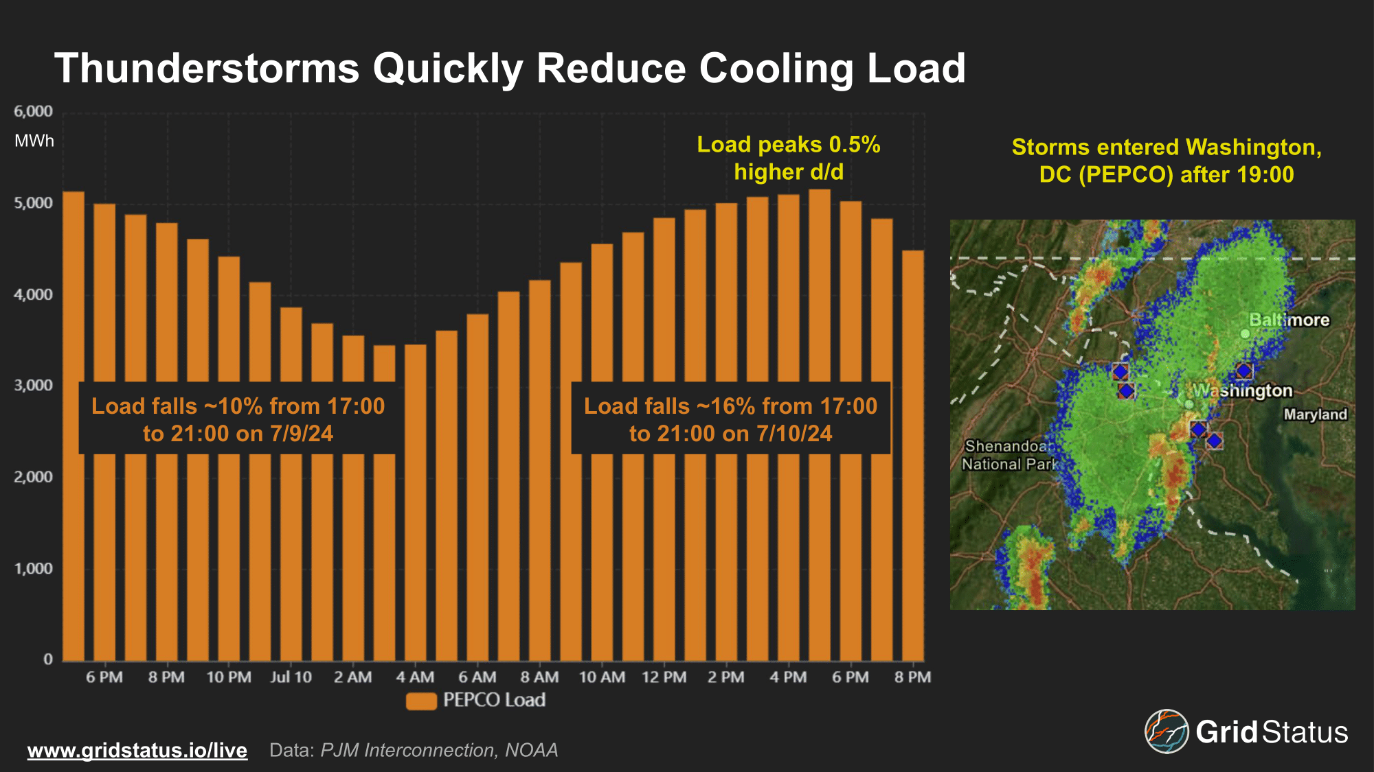 As we mentioned earlier, thunderstorms during the summer are bearish for cooling load, particularly over the afternoon and evening. The same system that pushed through Northern Virginia had impacts across the Potomac in densely populated Washington, DC. On both July 9th and 10th, warm summer weather drove demand peaks over 5 GW in the late afternoon. Load fell more gradually after the peak on the night of the 9th, with a 10% reduction in load over a four hour period as temperatures slowly moderated after sunset. Thunderstorms the following night allowed for temperatures to fall rapidly, resulting in a 16% drop in load over the same time period, even as load peaked slightly stronger day over day.