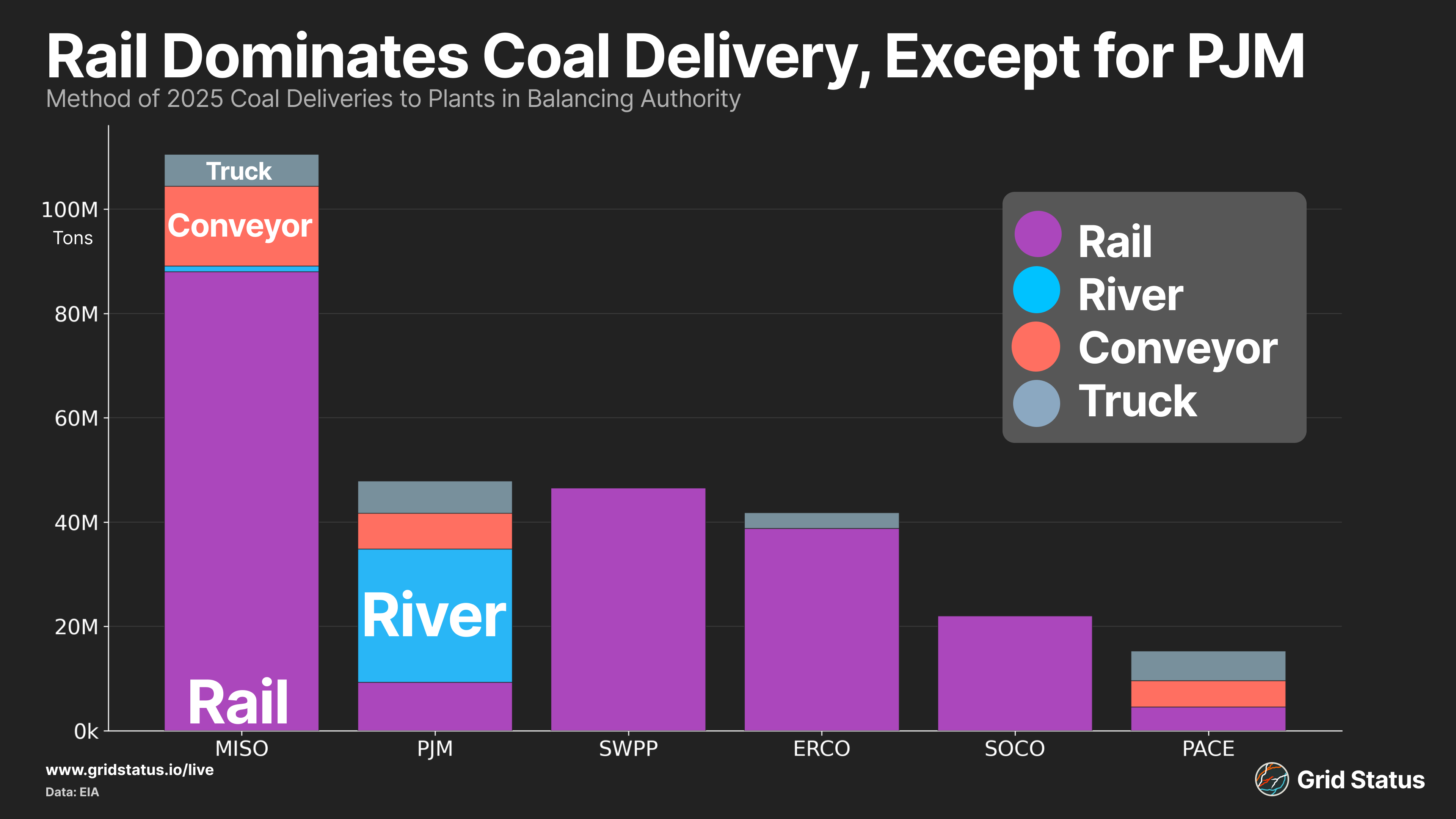 Rail is the clear leader in transportation, and dominates the large western mines. Barge traffic is a larger player in the eastern US, and particularly in PJM. Major coal plants on the Ohio River receive shipments via Ohio River barges. Winter storm Fern exposed the fragility of barges. Ice built up along the Ohio River as a result of extreme cold temperatures. Beyond rivers, large portions of the Great Lakes, including Lake Erie, have frozen over, which impacts vessel traffic.
