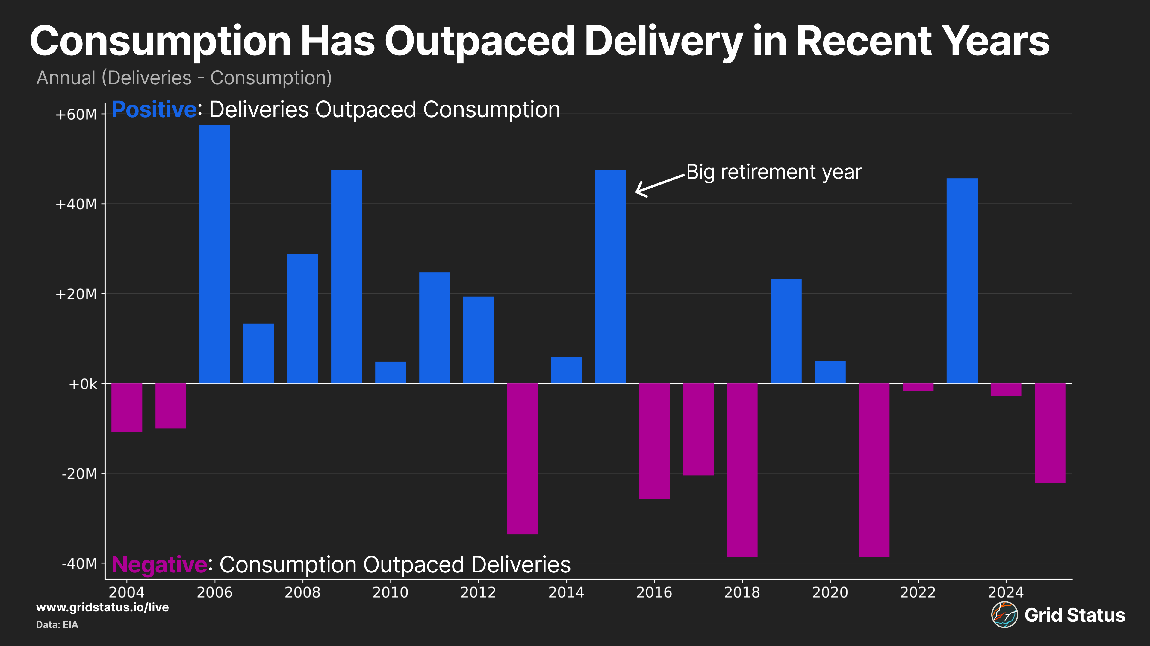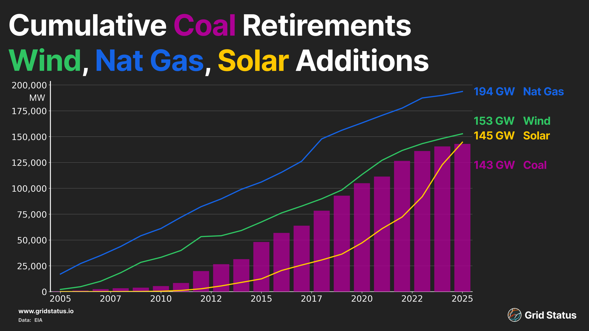 At the beginning of 2025, the EIA reported nine GW of annual retirements across 12 different plants. By New Year’s Eve, only three GW had officially retired. Six coal plants did pulverize their final tons in 2025: Indian River in Delaware at 445 MW, Prairie Creek in Iowa at 15 MW, Cholla in Arizona at 425 MW, Intermountain Power Project in Utah at 1640 MW, Naughton in Wyoming at 775 MW, and Merrimack at 400 MW in New Hampshire (which technically was a deactivation so this unit does not show up as an official retirement in the EIA data). Ultimately, however, more plants (and capacity) remained online.
