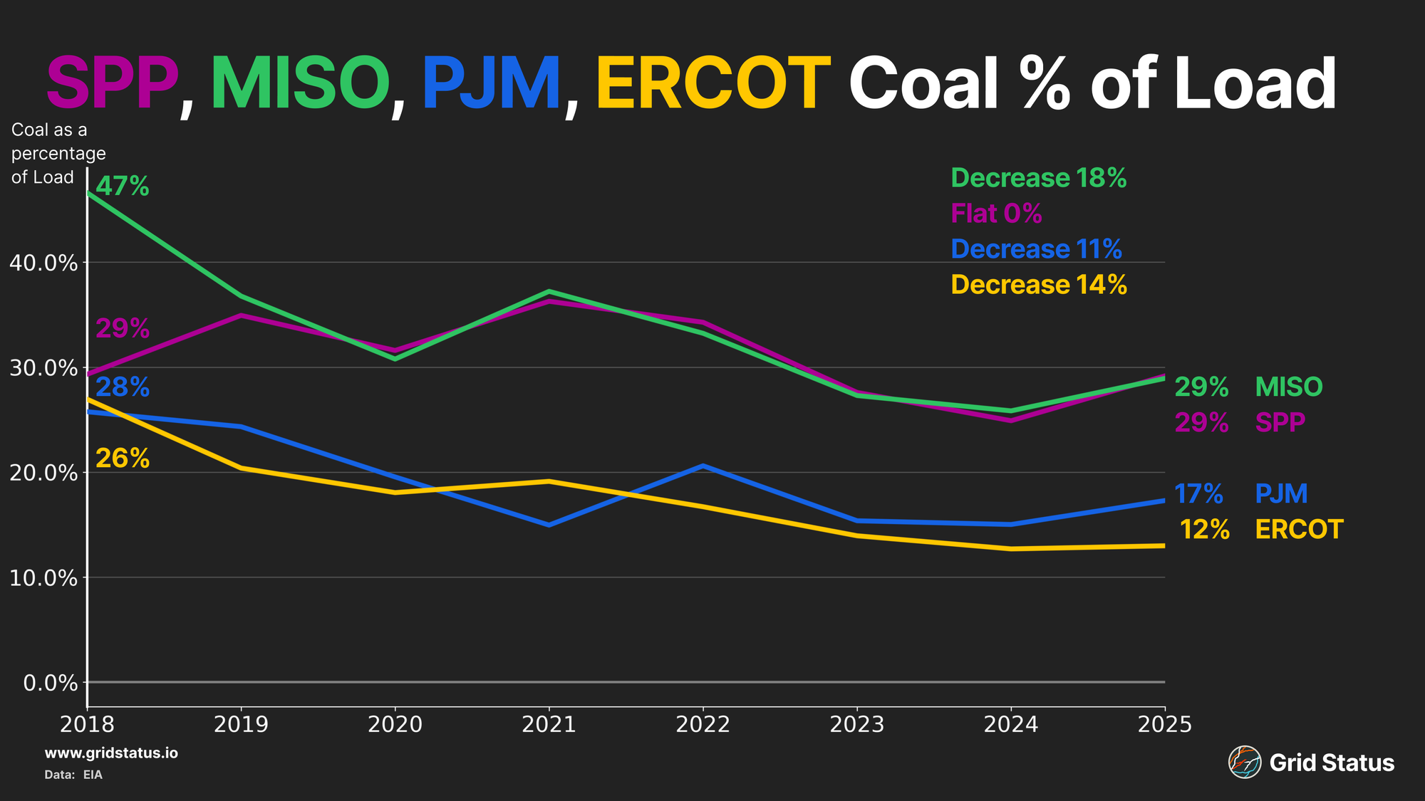 While coal generation has broadly declined, it remains prominent in a few key markets, mainly in the interior of the country. Coal still plays a big role in SPP, MISO, PJM, and ERCOT.