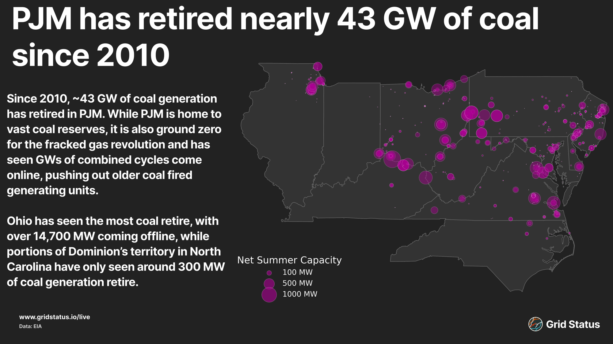 Much of the drop in capacity is located in the traditional homes of coal generation in PJM: Ohio and Pennsylvania. The two states comprise over half of the region’s lost coal capacity. While much of this can be attributed to access to cheap gas, deindustrialization across the rest belt is also a contributing factor.