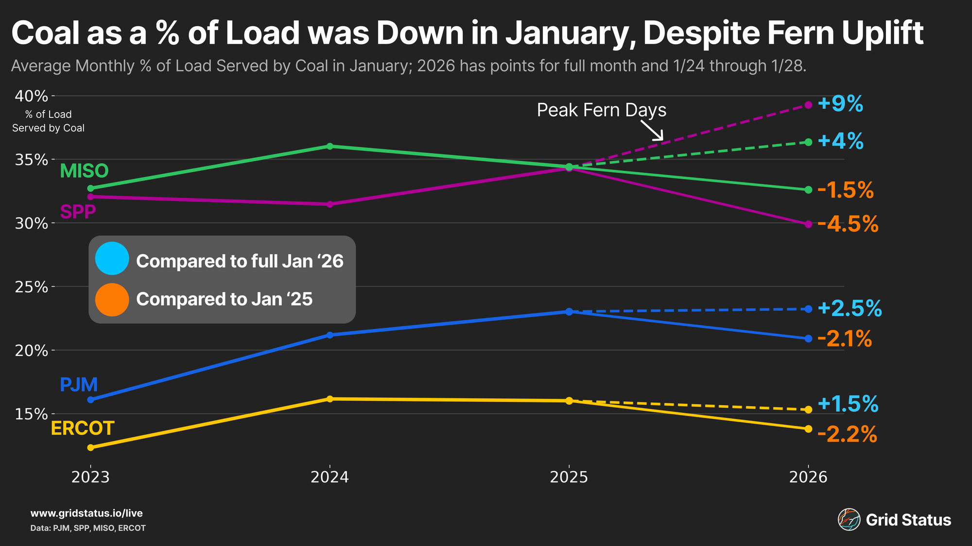 MISO and SPP saw an uptick in coal burn compared to earlier in the month, reaching prior-year averages or above. PJM saw coal burn stay consistent as a percent of load despite gas constraints, which is interesting to see as prices suggested a highly strained grid. Despite the Fern pickup, January coal generation ended up below 2025 across all four markets.