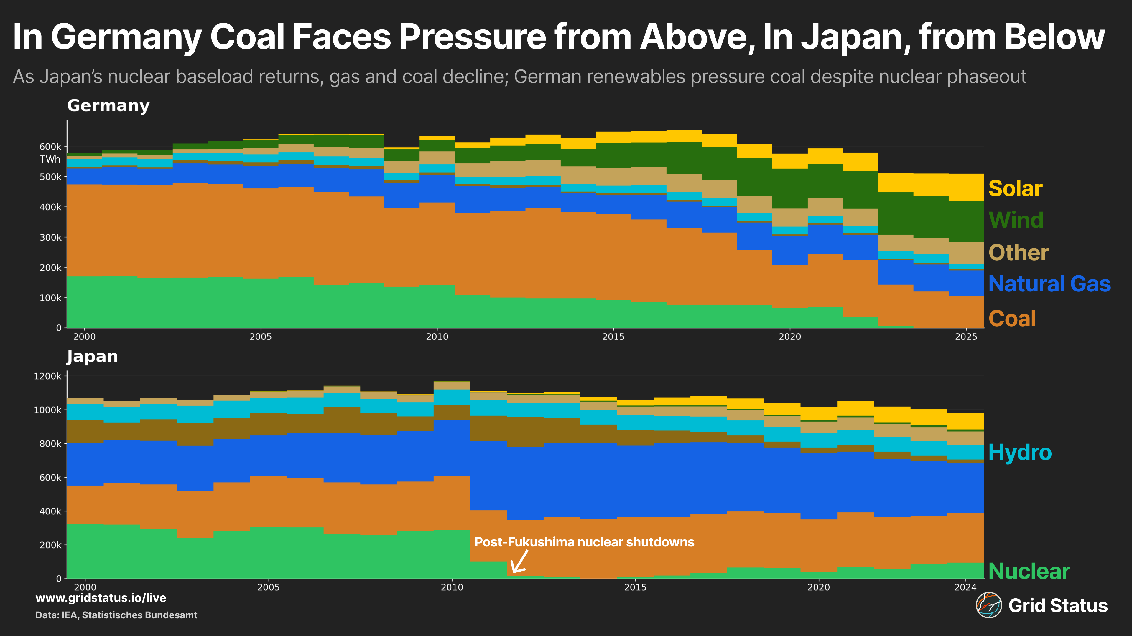 In Japan, the return of its nuclear generators directly cuts into coal and gas generation, with more expensive gas plants feeling the pressure first. 2025 and 2026 are likely to see further substantial cuts into gas and coal as larger units have been returning and the buildout of other resources continues.