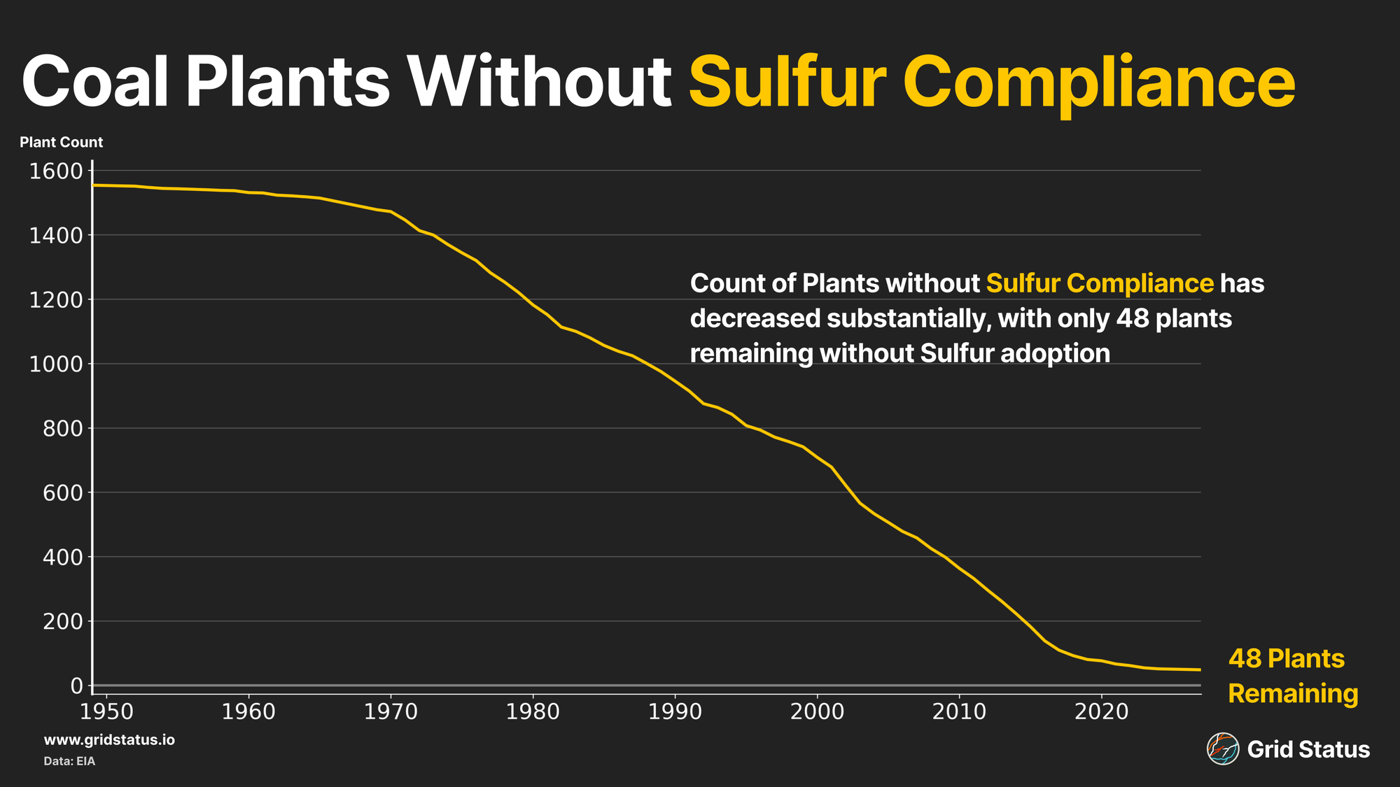 As a solid fuel, coal has baggage. Depending on the classification and rank, different amounts and compositions of water, minerals, and gases come along with the carbon. Everyone knows the story of CO2 (of which coal is the single largest source), and some are aware of the patchwork of carbon markets across the globe, but those other elements in a given lump of coal drive acute health and environmental damage. Since the 1970s, environmental regulation has tackled some facets of these hangers-on, to varying effect. Sulfur, and in turn the formation of Sulfur Oxides, has been one of the more successful stories, albeit not without much wailing and gnashing of teeth amongst the industry. Emission control technologies are why a plant that came online in the 60’s isn’t producing the same emissions it did 60 years ago. Technologies such as Flue Gas Desulfurization Systems, which reduce the SO2 emissions from flue gas generators associated with plant boilers. These systems require power, reducing total output per coal burned, but reducing SO2 is important as it contributes to the formation of ambient particulate matter, which can cause cardiovascular and respiratory disease.