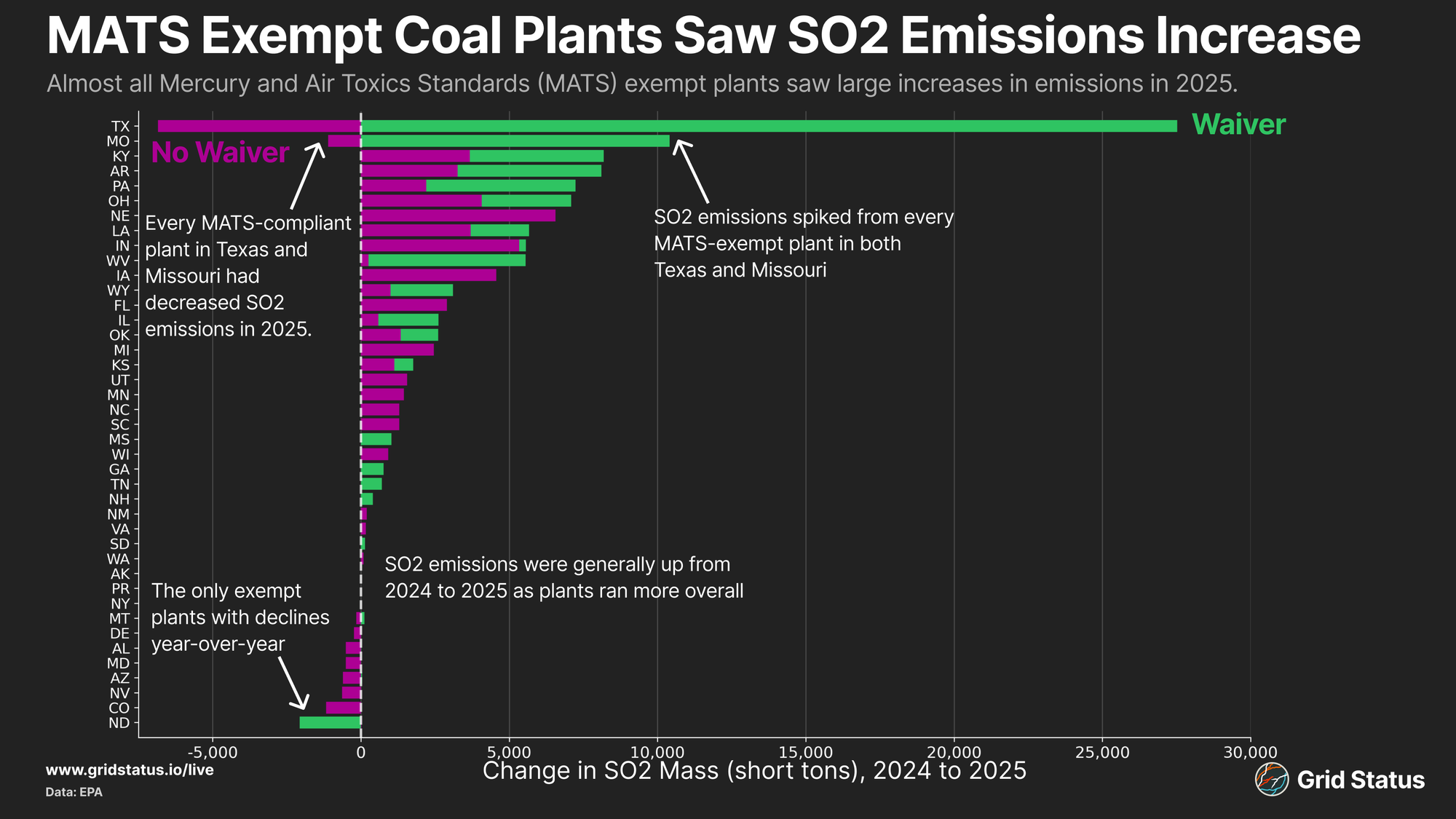 Plants in Texas and Missouri top the list for increased SO2 output, while the only facilities with declines in those states do appear on the list of exemptions. Coal plants overall ran more, but the rate of SO2 output also changed for a number of facilities.