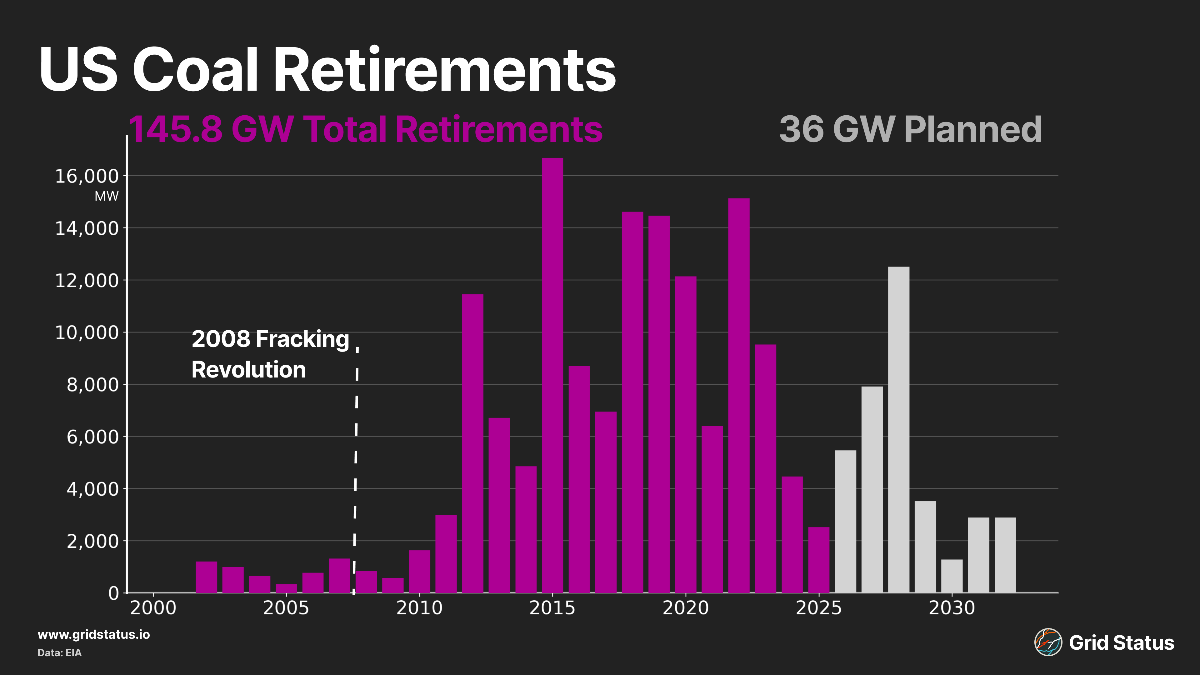 The EIA's latest numbers show 36 GW of retirements planned between now and 2032, but that’s following the lowest capacity-retirement year in a decade. The 2032 coal closeout looks like it might not verify, as existing plants are supported by high capacity prices, queue difficulties, and a data center industry creating a turbine backlog for behind-the-meter power alone.