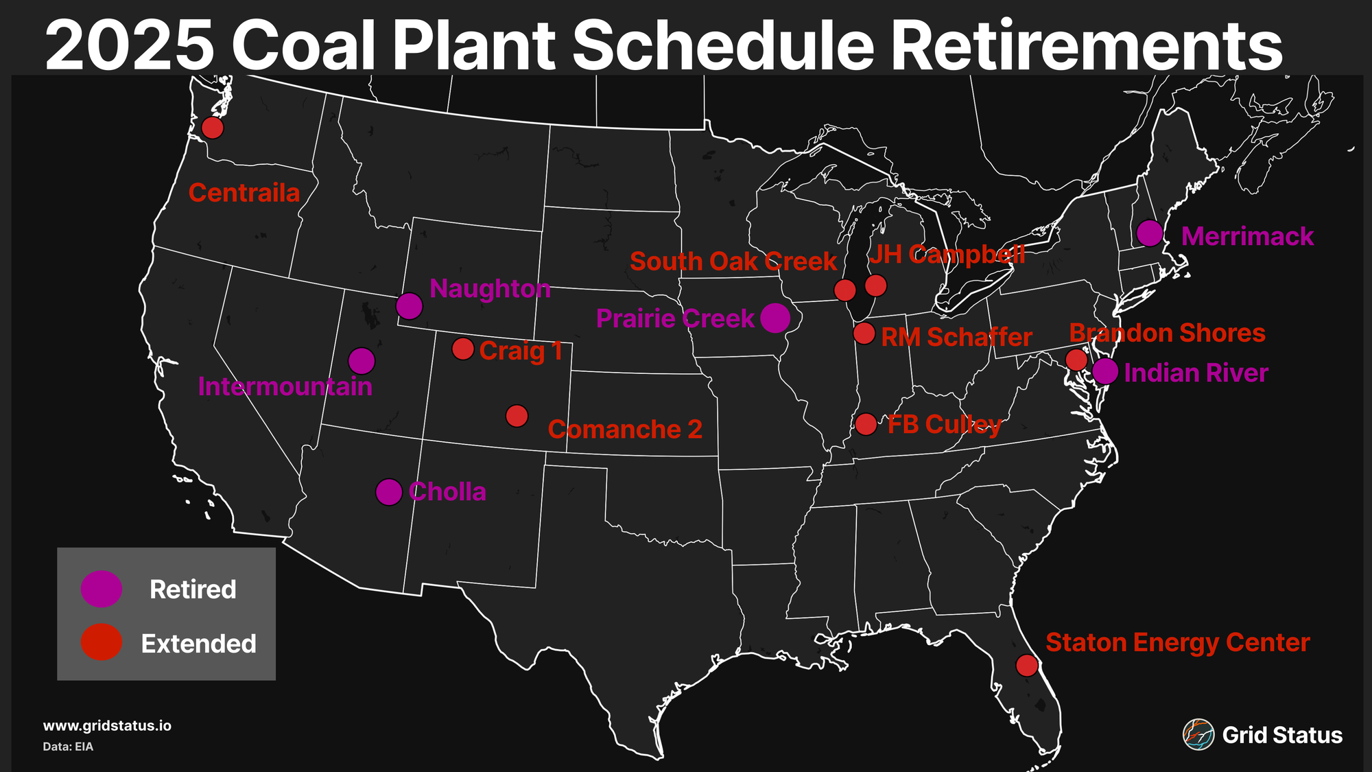 While some plants were kept from retirement, and others returned from hiatus, a handful mentioned above retired in 2025. Near the beginning of the year we covered the retirement of Indian River on the Delmarva peninsula after an early end to its reliability must run (RMR) agreement. Since then, a few more have exited the stack.