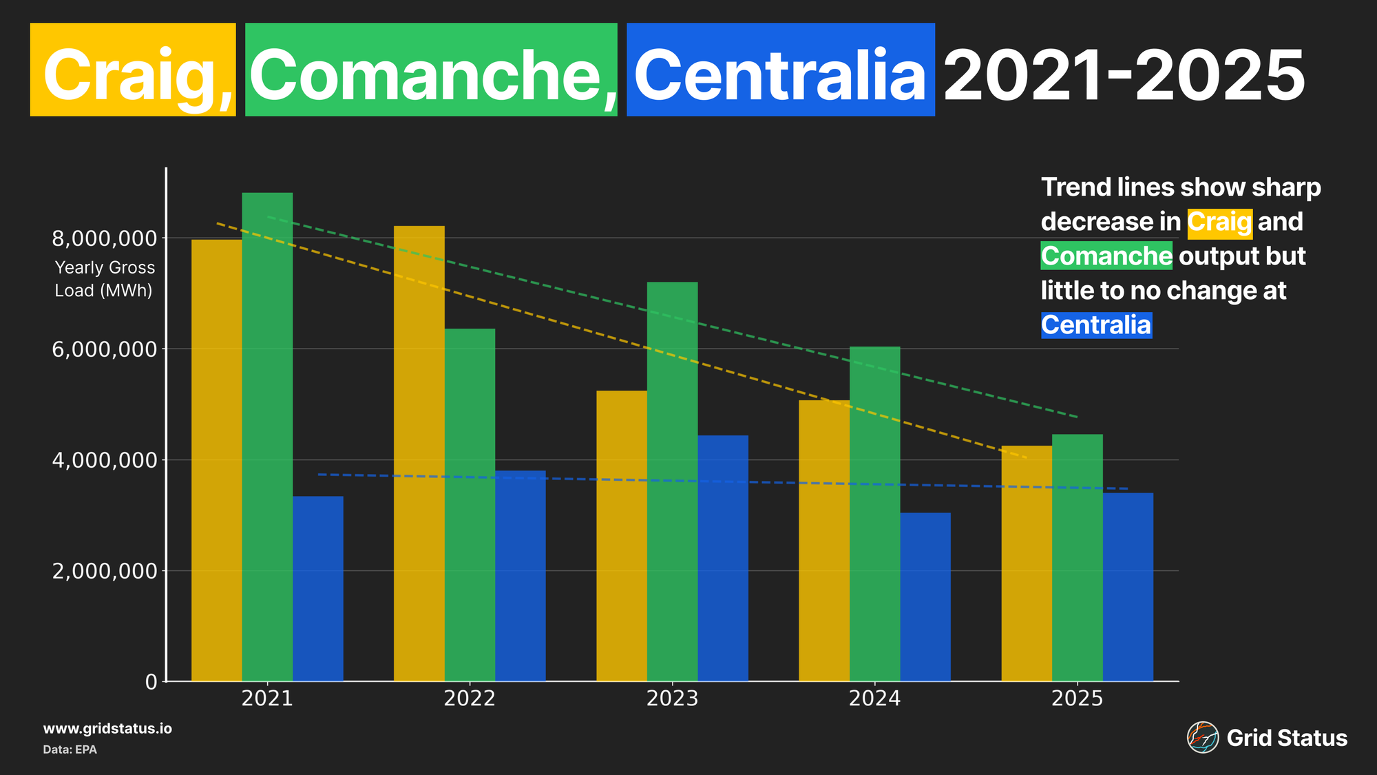 Coal generation at Craig and Comanche has decreased steadily over the 2020s, with gross output declining to half of what it was 4 years ago. The plan is to replace Comanche coal with solar and a battery connected to the same transmission network. Buildout of the solar portion of this project has already started, but the battery portion has seen delays in permitting and has yet to start construction.