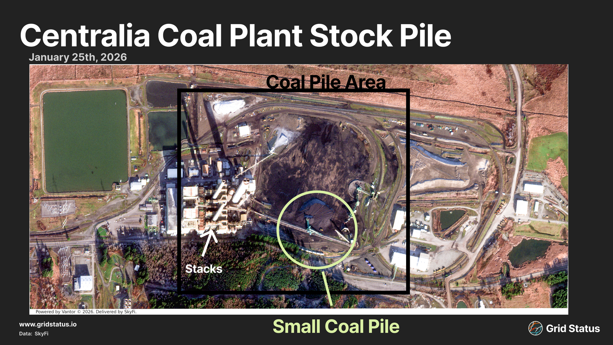 TransAlta has also signed a contract with Puget Sound Energy to convert Unit 1 from coal to natural gas, with a rated capacity of 700 MW. Unit 2 was given the coal operation extension, and given the recent history we wanted to explore its continued feasibility. A recent satellite image confirmed some onsite coal, although the pile is quite small.