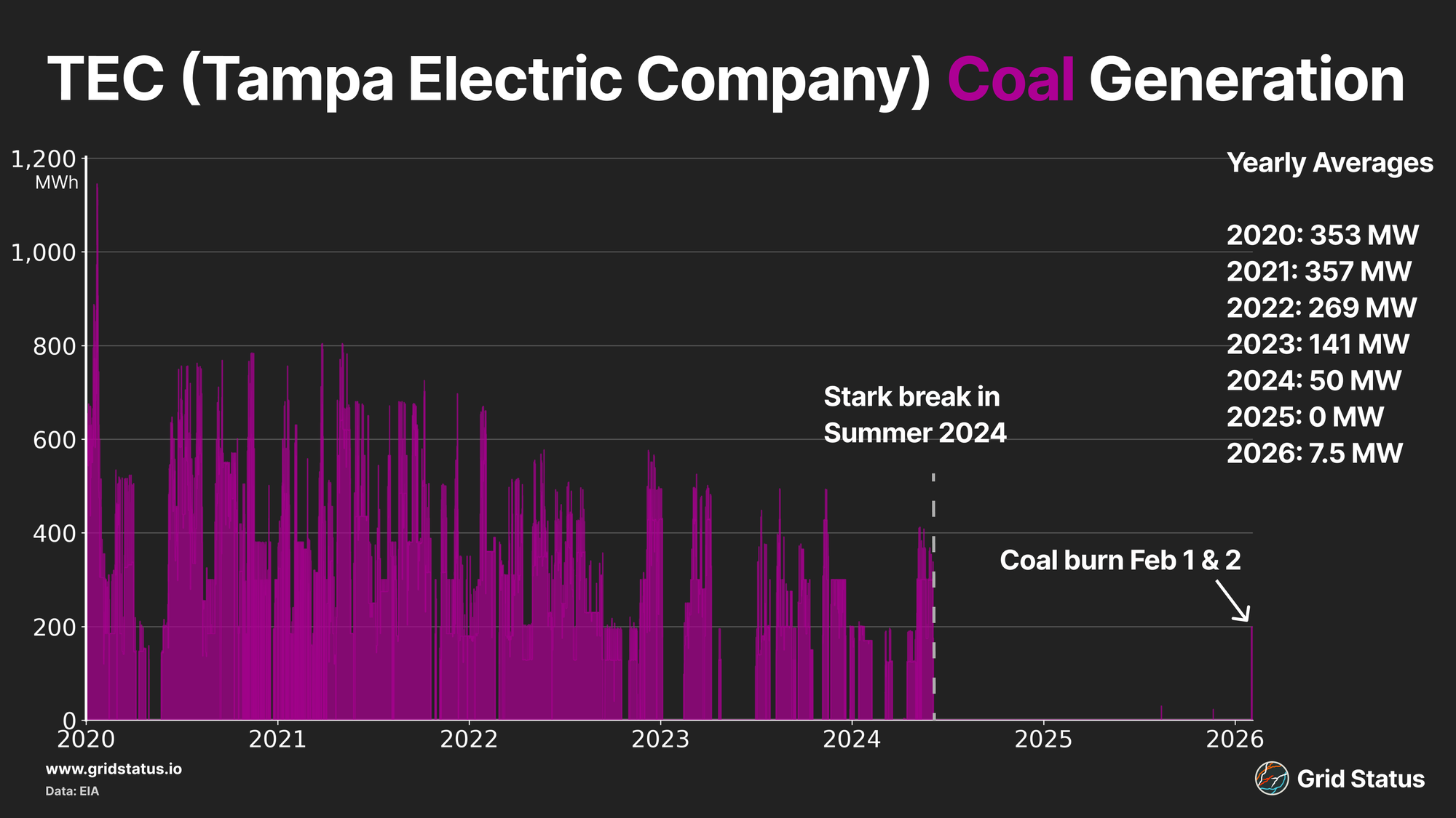 TEC had converted most of the units of the plant to natural gas, but a single coal unit remains. Cold weather pushed into the state, leading to a combination of natural gas constraints. Load increased dramatically as electric heating impacts were felt and TEC turned to coal at Big Bend, which had maintained a significant pile, to help supply the stack despite sitting idle for 1.5 years. The last coal delivered was in December 2024, 2025 this plant only saw 184.4k tons delivered which was half the amount delivered in 2023.