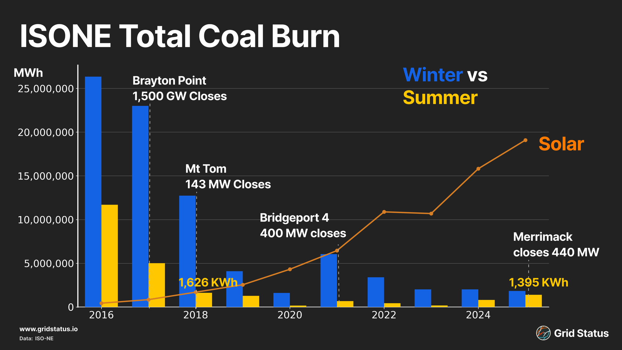 Merrimack marked the last, but certainly not the first, coal retirement for this small grid. Coal saw a significant drop off in generation following the Brayton Point and Mt Tom closures.