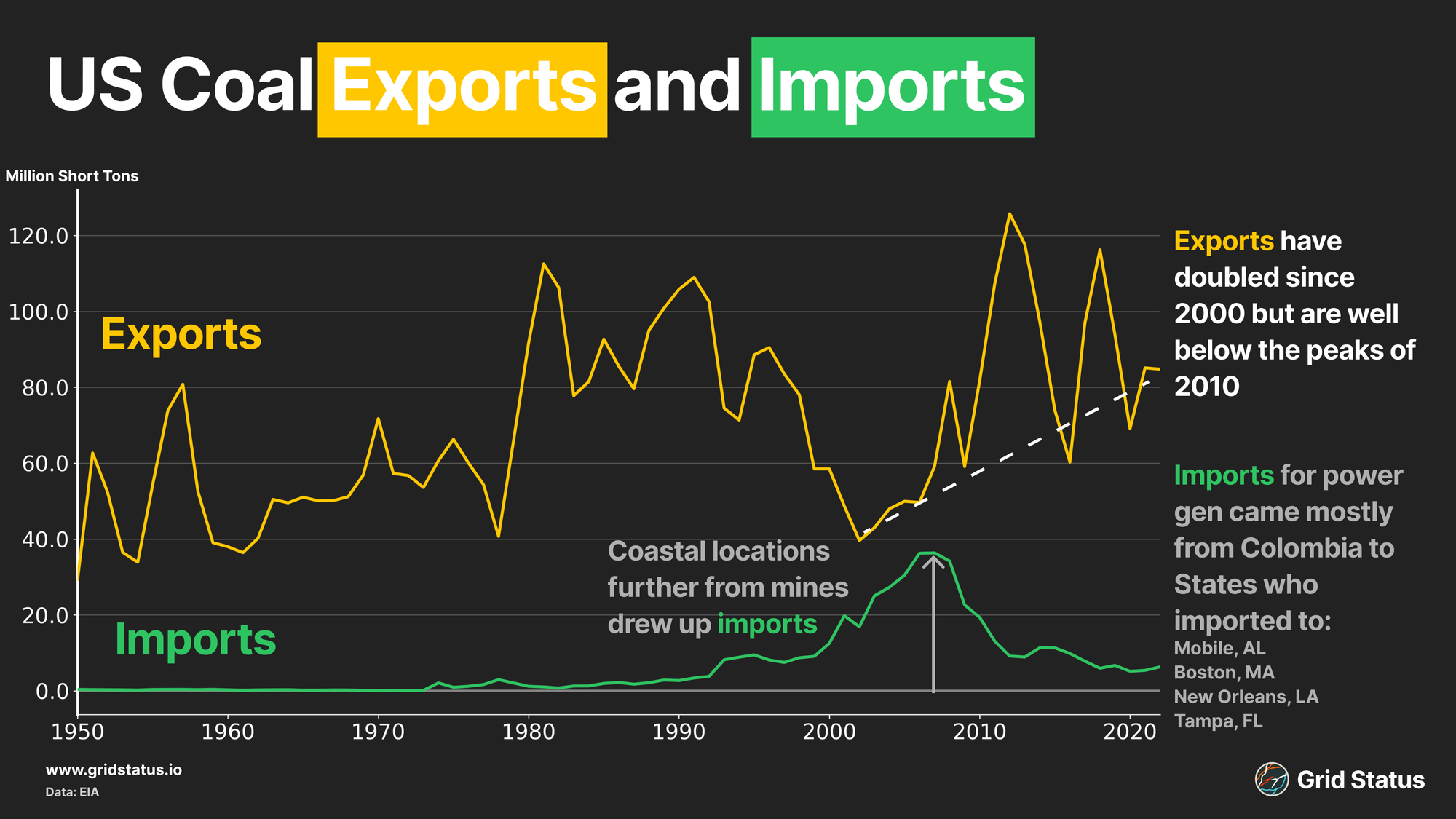 Annual exports have been volatile, swinging widely based on broader global macroeconomic conditions and energy costs. More surprising to Americans may be the high import values just prior to shale gas. Before coal retirements began in earnest, a number of coastal areas found it easier and cheaper to import coal from abroad, particularly from Colombia. In 2006, Mobile, Alabama peaked at nearly 13M short tons of imports, while Tampa, Florida peaked at 4.7M short tons of imports in 2008.