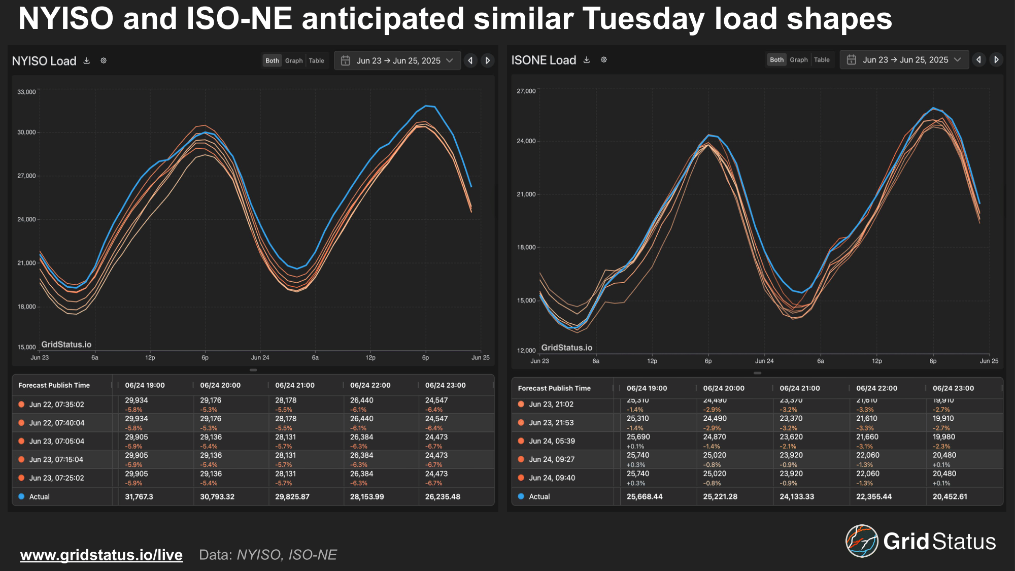 Both NYISO and ISO-NE caught the trend relatively well, too, although the actual load on Tuesday in New York outstripped even the highest forecast by more than 1 GW.