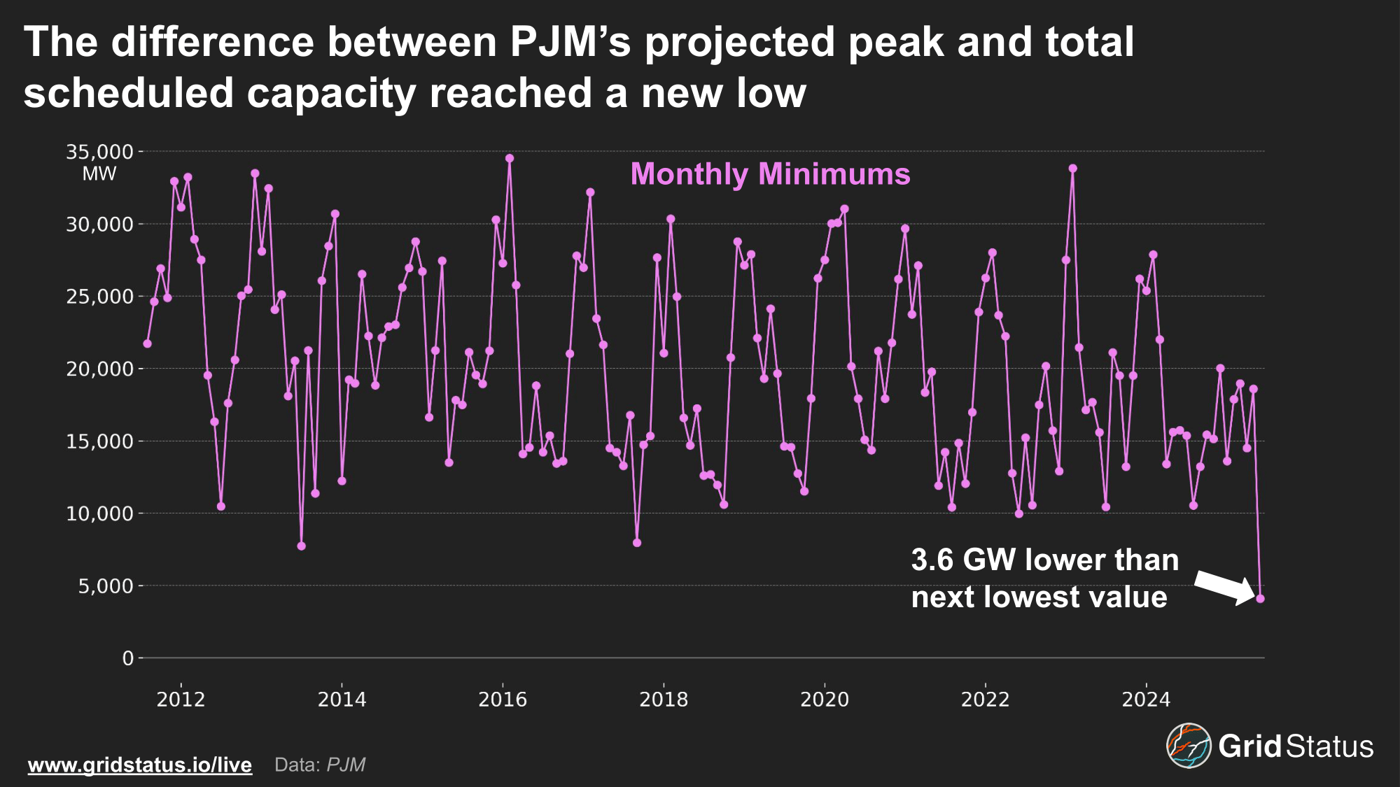 PJM saw forecasted reserve margins dip to their lowest level in years on Tuesday. Operational reserves fell to 4.1 GW as only 165.2 GW of capacity was scheduled to meet a forecasted load peak of 161.1 GW.