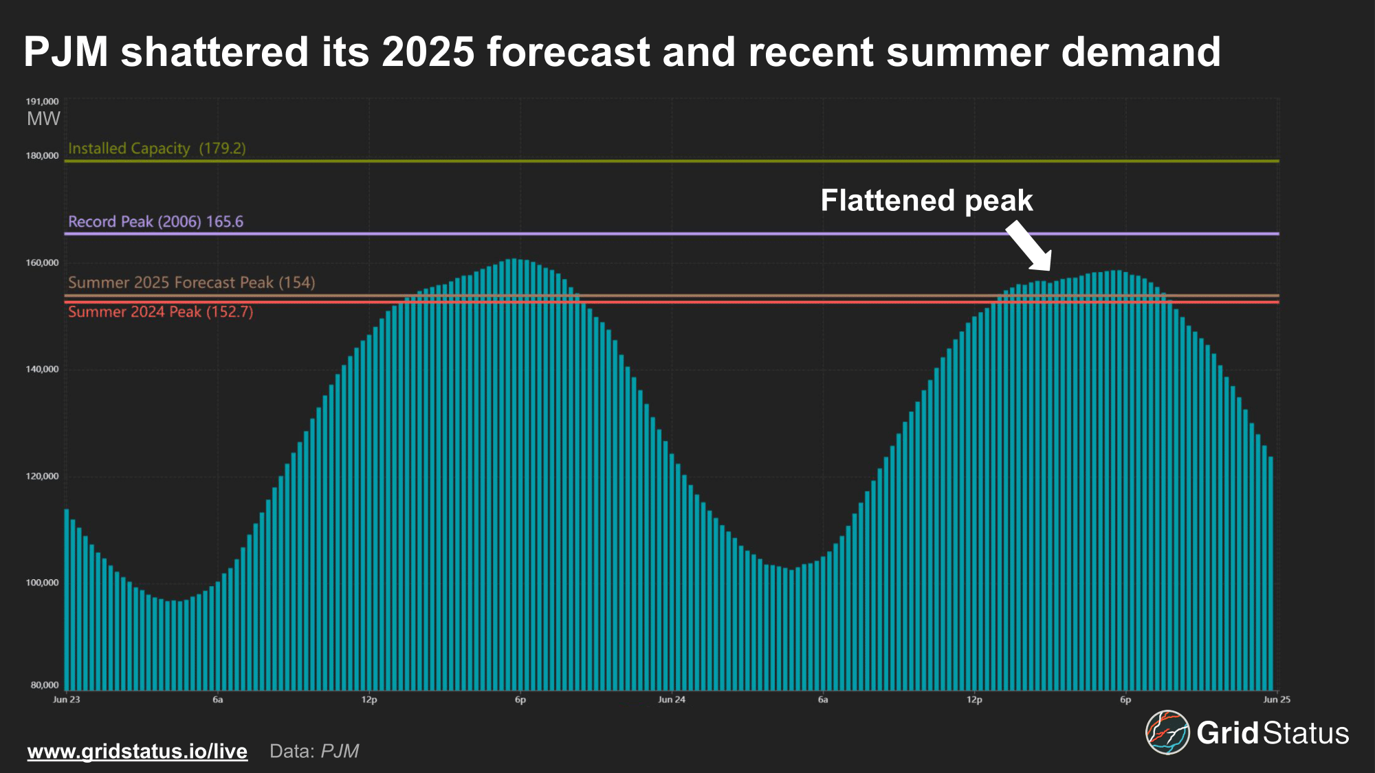 This initial Tuesday value even exceeded PJM’s pre-summer peak load forecast of 154 GW and was meaningfully higher than the previous summer’s 152.7 GW peak.