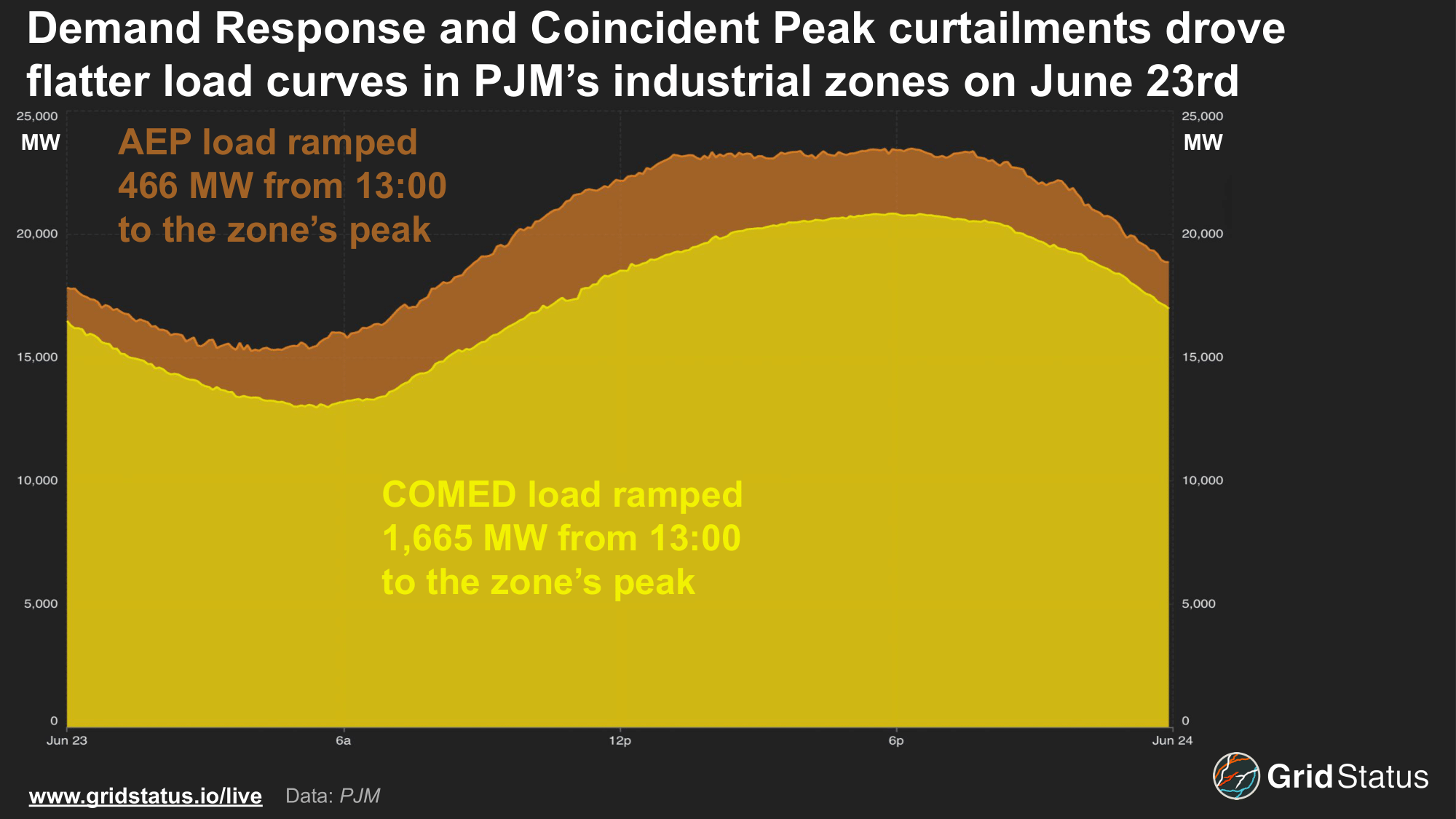 Beginning at 13:00 on June 23rd, PJM’s American Electric Power (AEP) load began to flatten out. From this time to the evening peak, load only increased by 466 MW. During the same timeframe, COMED, heavily dominated by residential demand in Chicagoland, saw load climb by well over 1,600 MW.