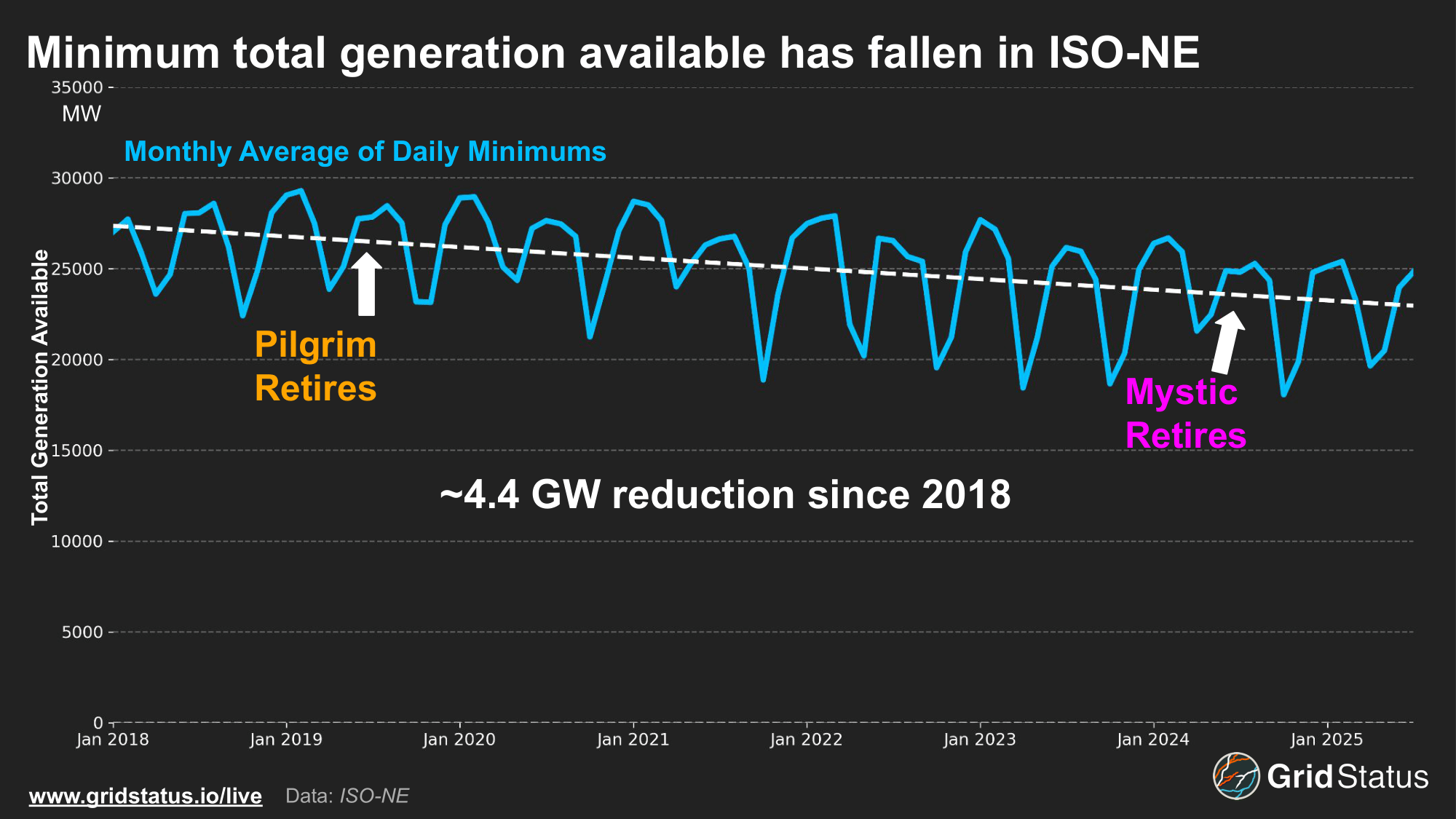 While Mystic is the most notable recent retirement, ISO-NE has been consistently losing thermal generation for years.