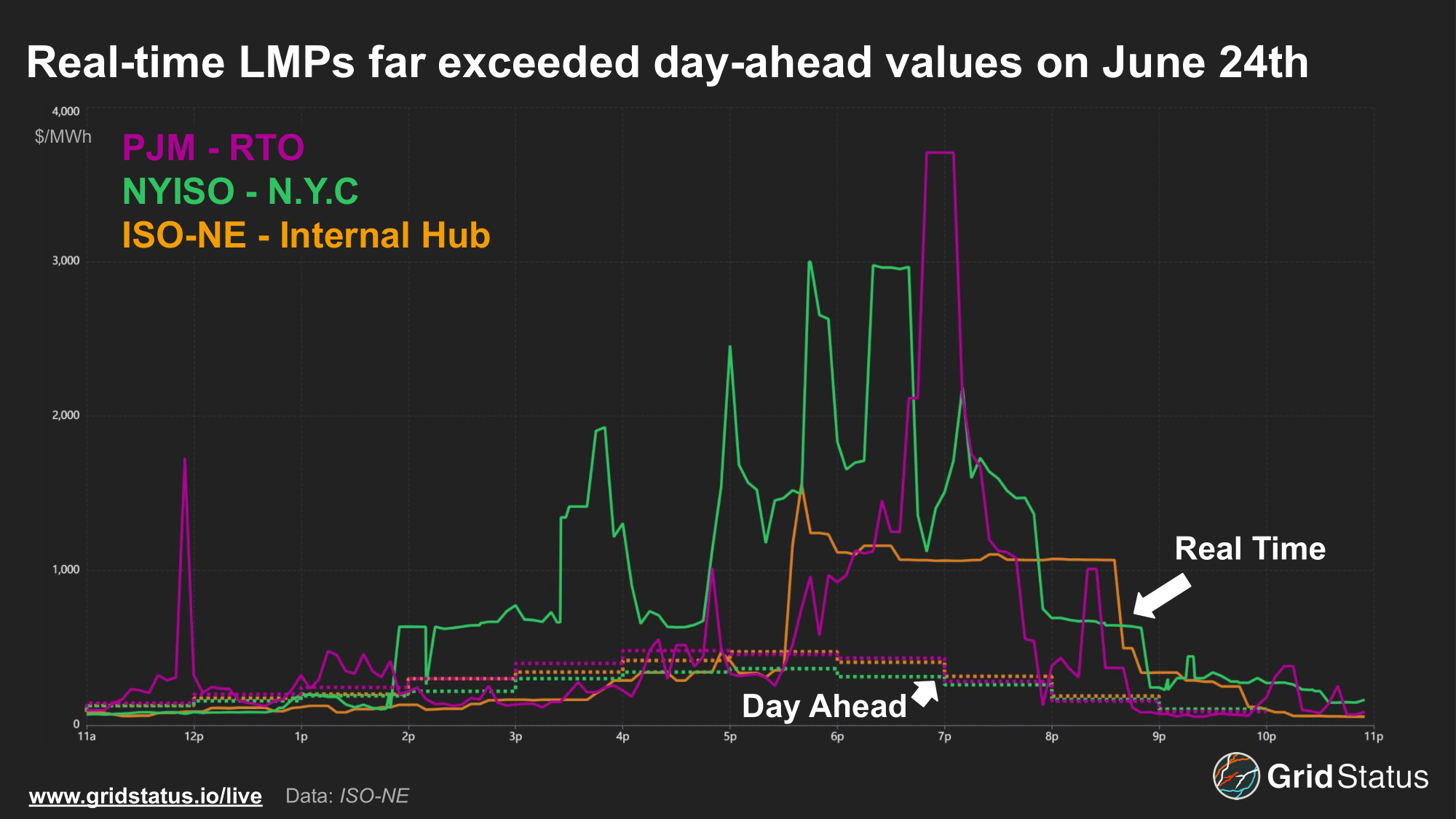 With ample warning and several days of hot weather already in the past, June 24th, Tuesday, was shaping up for peak conditions. Day-ahead prices were high across affected markets. ISO-NE LMPs cleared above $400/MWh through the evening peak on Tuesday, reaching $473/MWh. These were the highest day-ahead energy prices seen since at least 2016, and they were still handily outstripped by prices in real time.