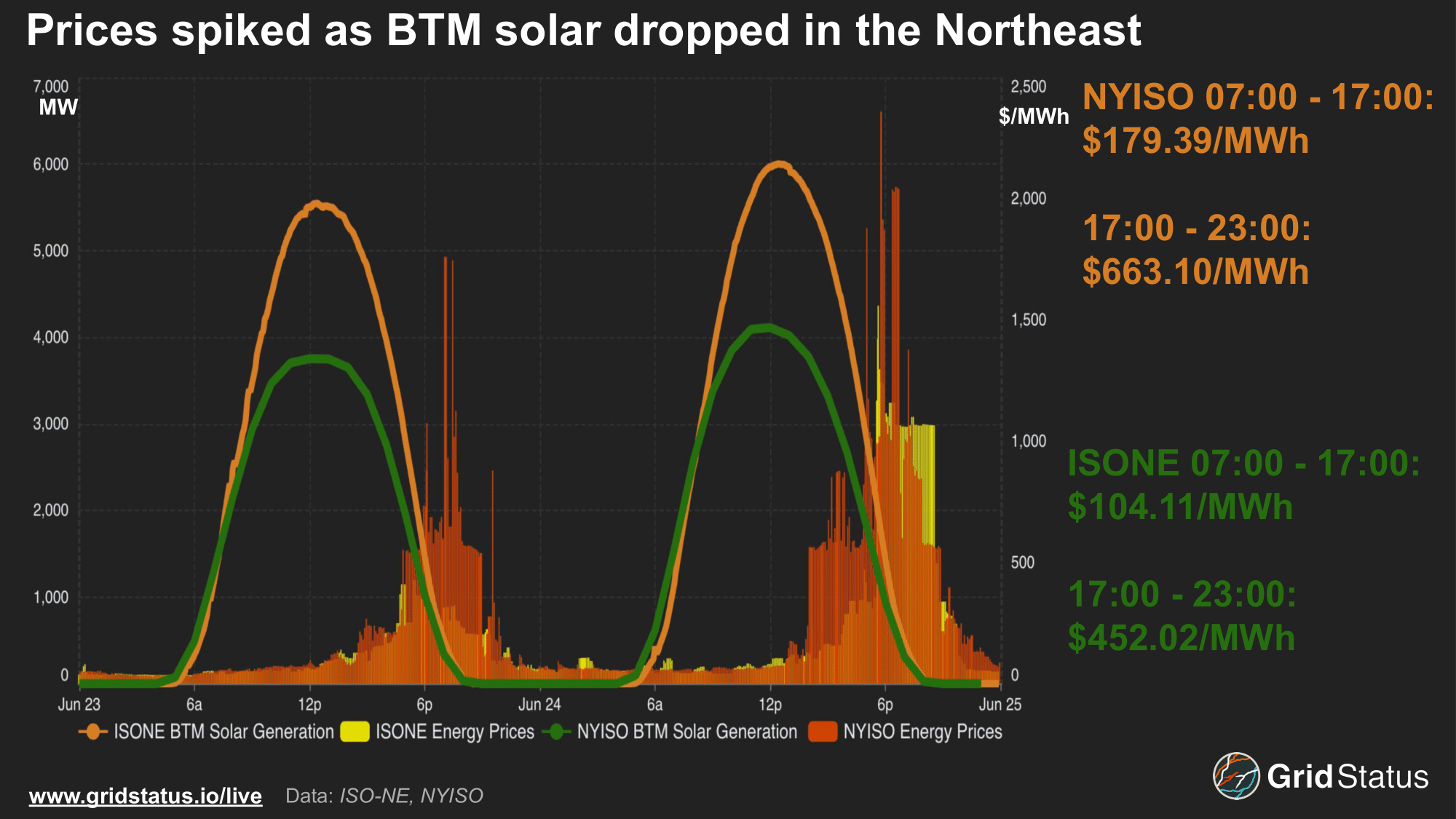 Even during extreme events like this week’s heat wave, BTM solar helped tame pricing through the midday. Combined generation between ISO-NE and NYISO peaked at over 10 GW on the afternoon of June 24th. This additional demand-dampening generation helped to suppress prices over the daytime hours.