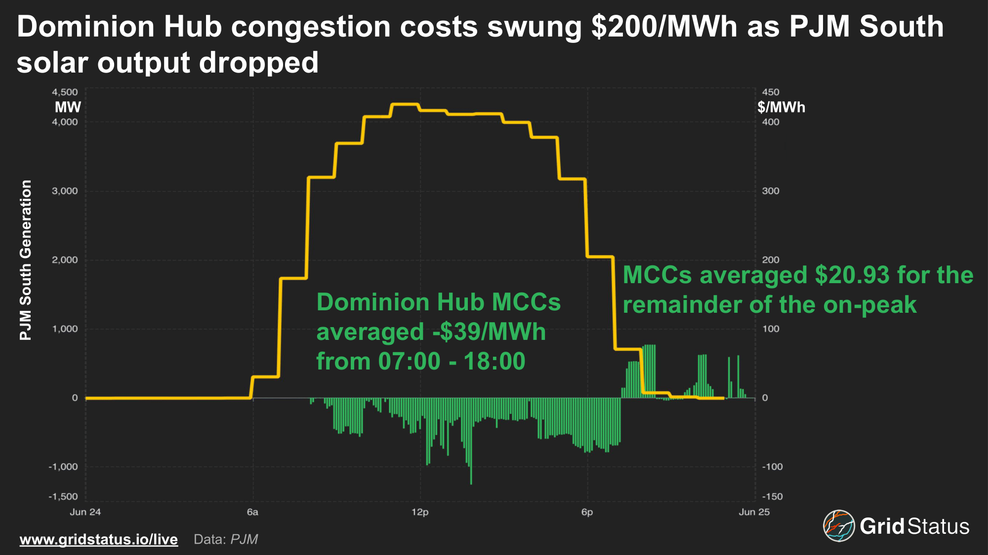 Similar impacts were seen on congestion prices, particularly those associated with solar generation in Virginia. The Dominion Hub aggregation is heavily correlated with solar assets, particularly those along the Virginia/North Carolina border. Congestion costs were negative over the afternoon as power struggled to flow into the Richmond area. As production fell, congestion swung positive at the same time as energy prices RTO-wide spiked.