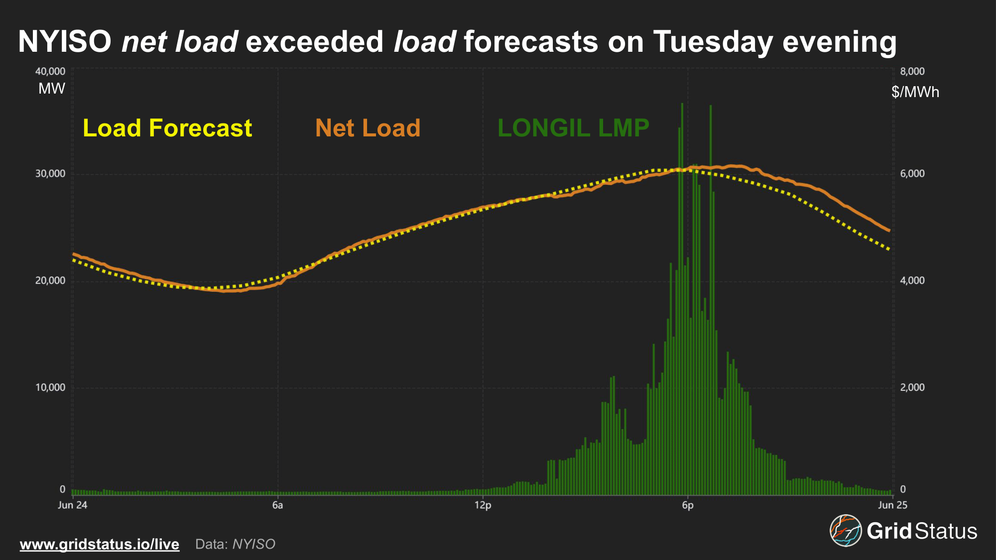 NYISO load overperformed so heavily that even net load exceeded the demand forecast. As a result, real-time prices spiked well above day-ahead clears, particularly in Long Island.