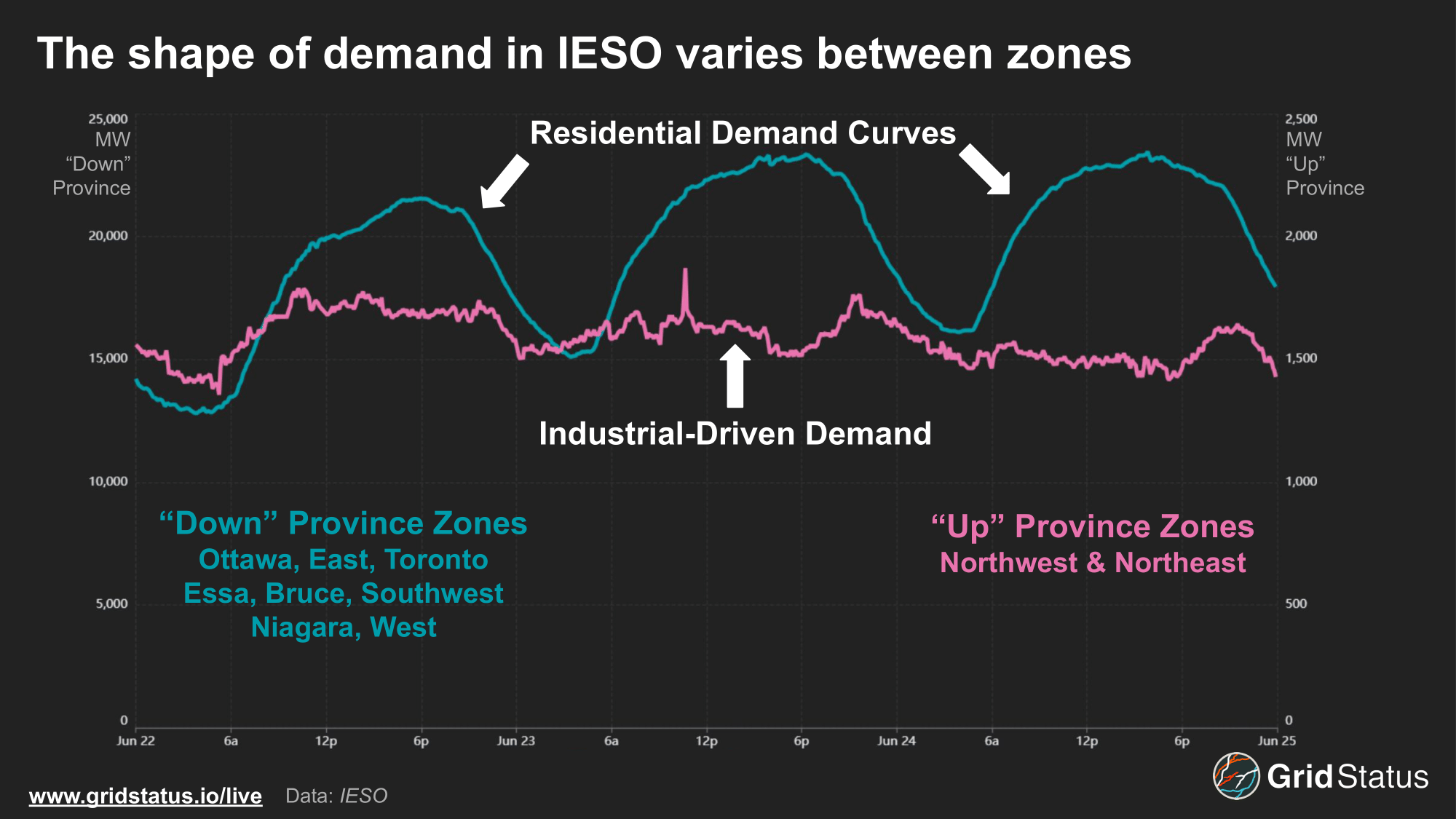 While relatively sparsely populated, these zones are home to energy-intensive industries like mining. As load climbed into the afternoon, these facilities, hoping to avoid global adjustment charges related to demand during peak intervals, began to curtail or switch to backup generation.