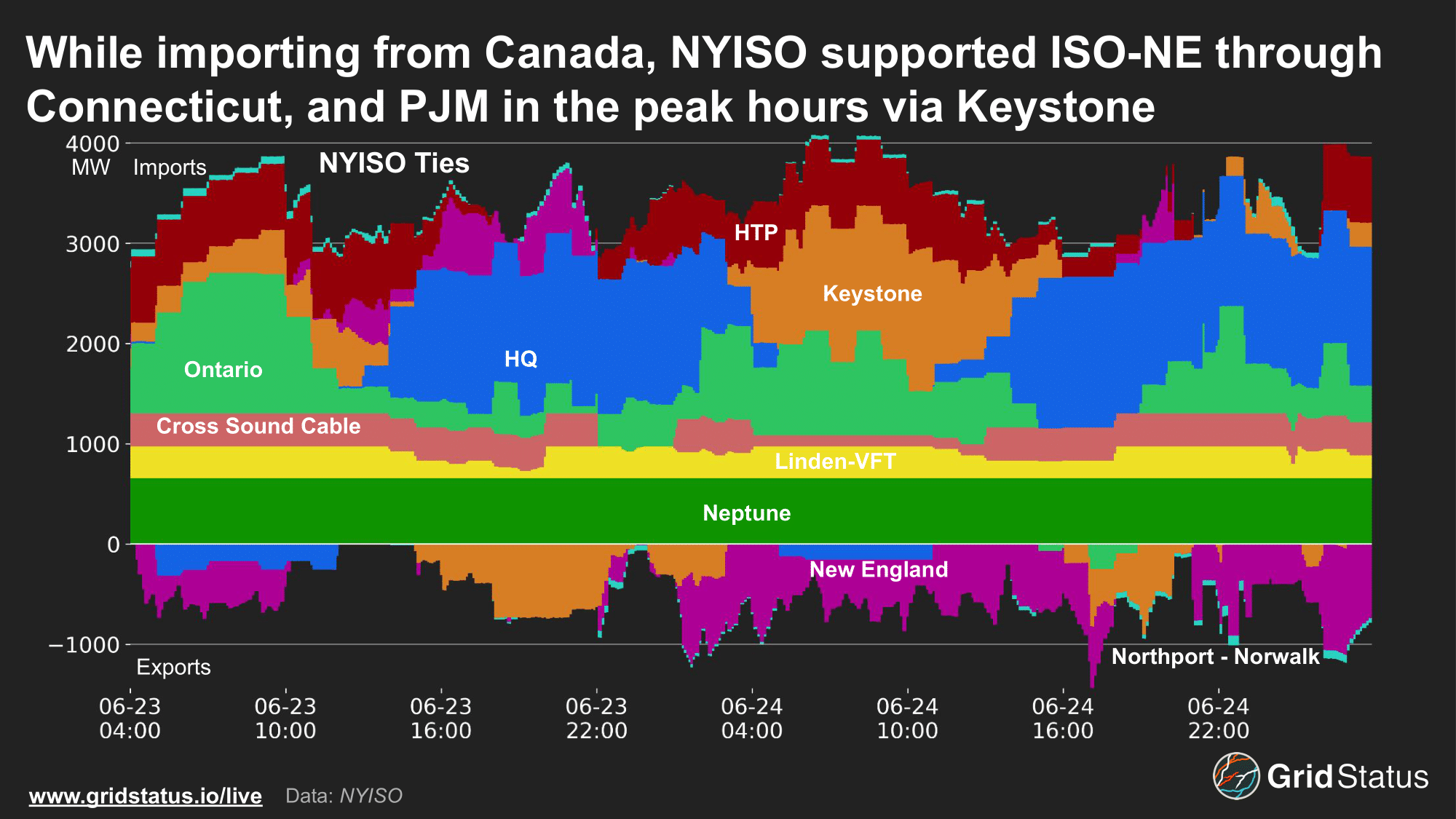 NYISO has two ties with ISO-NE that interconnect at Long Island, and a bundle of lines further upstate into Connecticut. The Cross Sound Cable (CSC) and Northport-Norwalk (1385) lines tend to flow towards NYISO because Long Island is often constrained. Meanwhile, the lines further upstate tend to export into ISO-NE. PJM tends to be more one-sided, often supporting NYISO. Neptune, Linden-VFT, HTP, and Keystone are PJM proxy buses. The first three are more of individual direct connections into the city area, not fully flexible connections in both directions. Keystone is different, supporting exports from NYISO when the conditions work out in that direction.