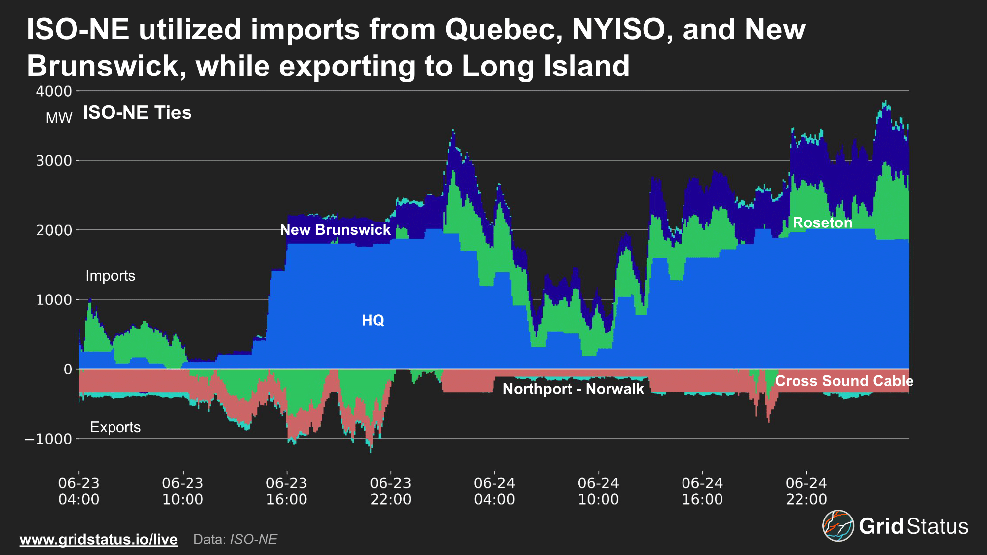 ISO-NE was its typical net consumer, with substantial imports from Canada as well as New York, although it continued to support Long Island via the Cross Sound Cable and the 1385 for much of the event. Imports from both Hydro-Quebec and New Brunswick picked up substantially compared to shoulder season operations, returning to the levels regularly seen during summer high load conditions.