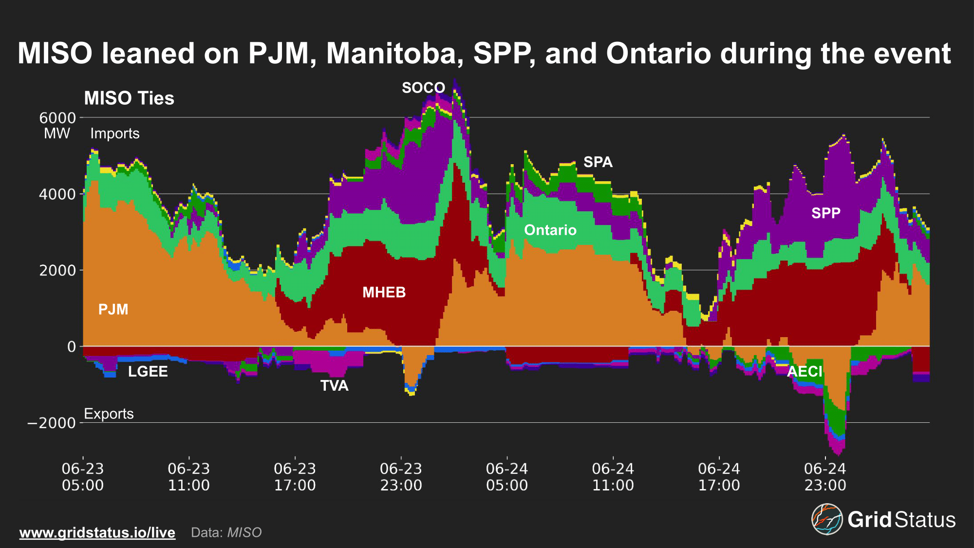 MISO imported substantial amounts of power throughout the event, particularly from PJM during off-hours. SPP, Manitoba (MHEB), and Ontario also supported MISO, particularly when imports from PJM dried up during the RTO’s own peak conditions. MHEB is Manitoba Hydro, which is utilized as an External Asynchronous Resource (EAR). Like PJM, MISO is also interconnected with non-market regions such as TVA and Southern Company (SOCO).