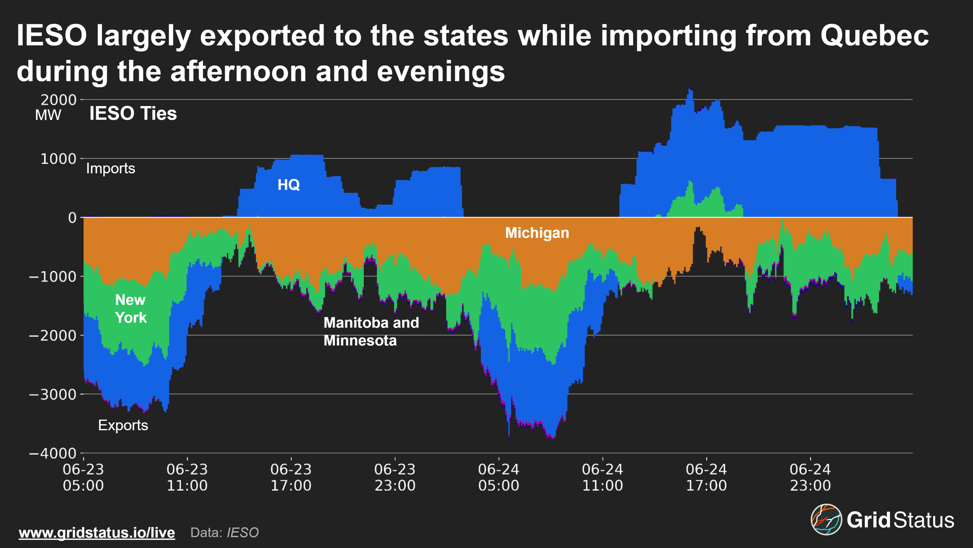 IESO (Ontario) fulfilled its normal role of exporting to the USA despite heat that pushed demand past a “normal” summer peak load forecast. This did flip on one occasion, as the evening of the 24th saw imports from NYISO. IESO also exported to Hydro-Quebec from off-peak hours into the late morning, while importing during the afternoon and evening. The Manitoba and Minnesota interfaces are fairly small, but do help to supply some fairly remote regions.