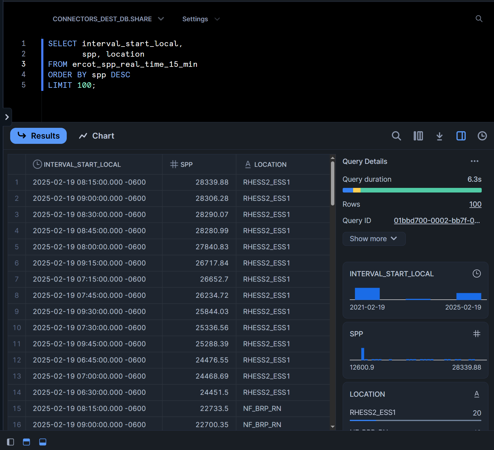 There's also an indirect method of finding these intervals and this location: just check the entire history of prices in ERCOT. While this is typically a compute-intensive operation that would take a long time to execute (let alone loading in data), we sync our data to Snowflake to make these kinds of analyses easier.