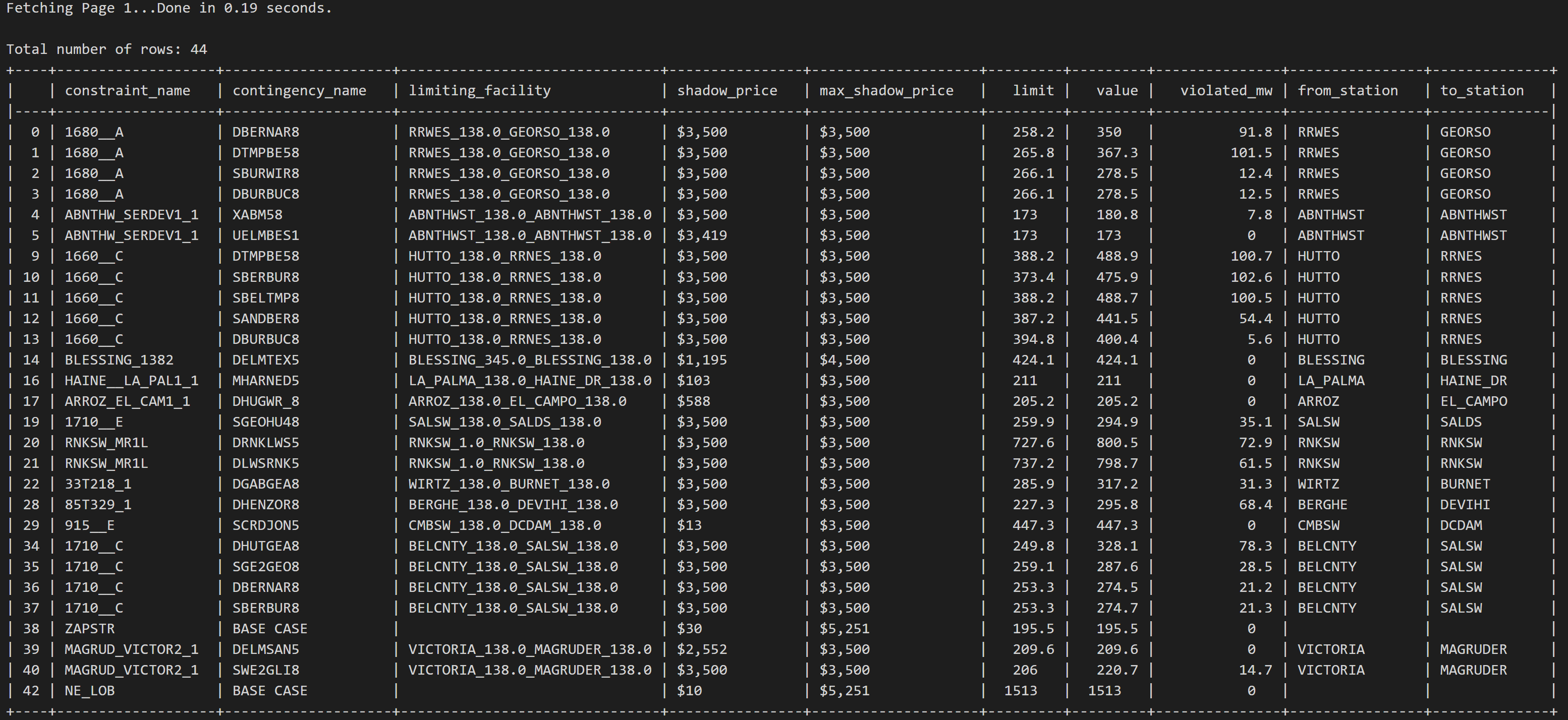 print(tabulate(df_clean, headers='keys', tablefmt='psql'))This returns the below table, which shows a high number of constraints where MW limits are being violated.
