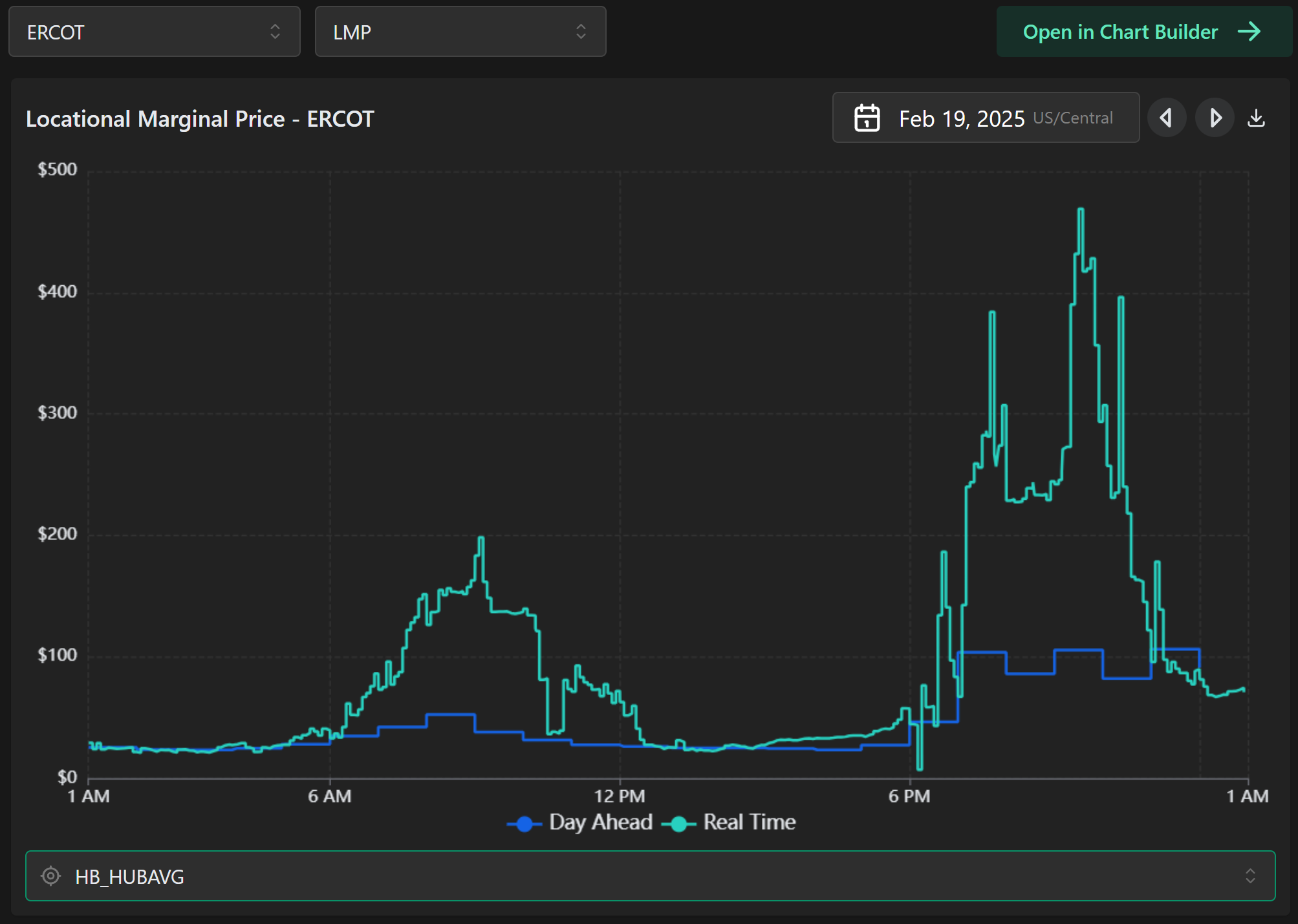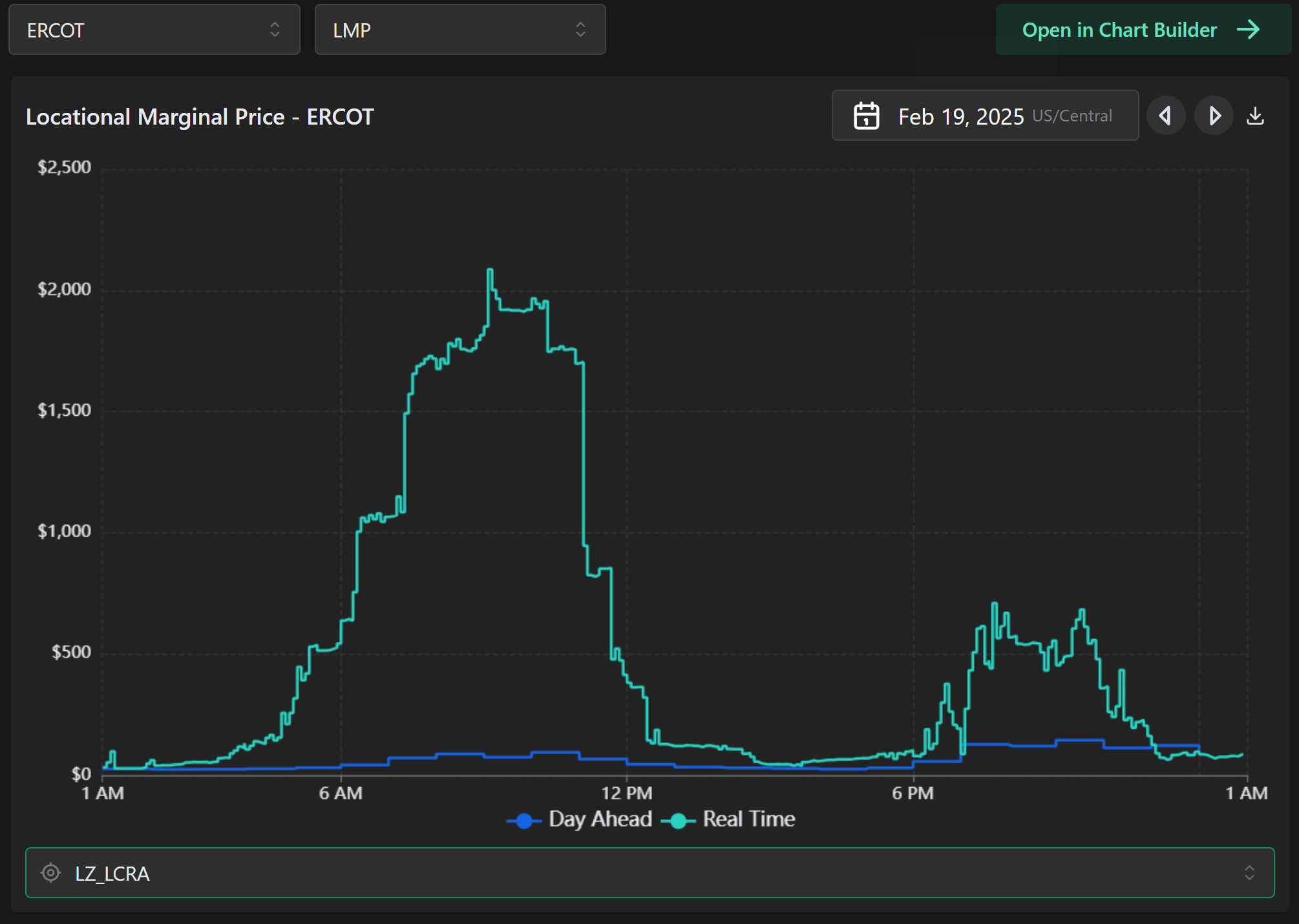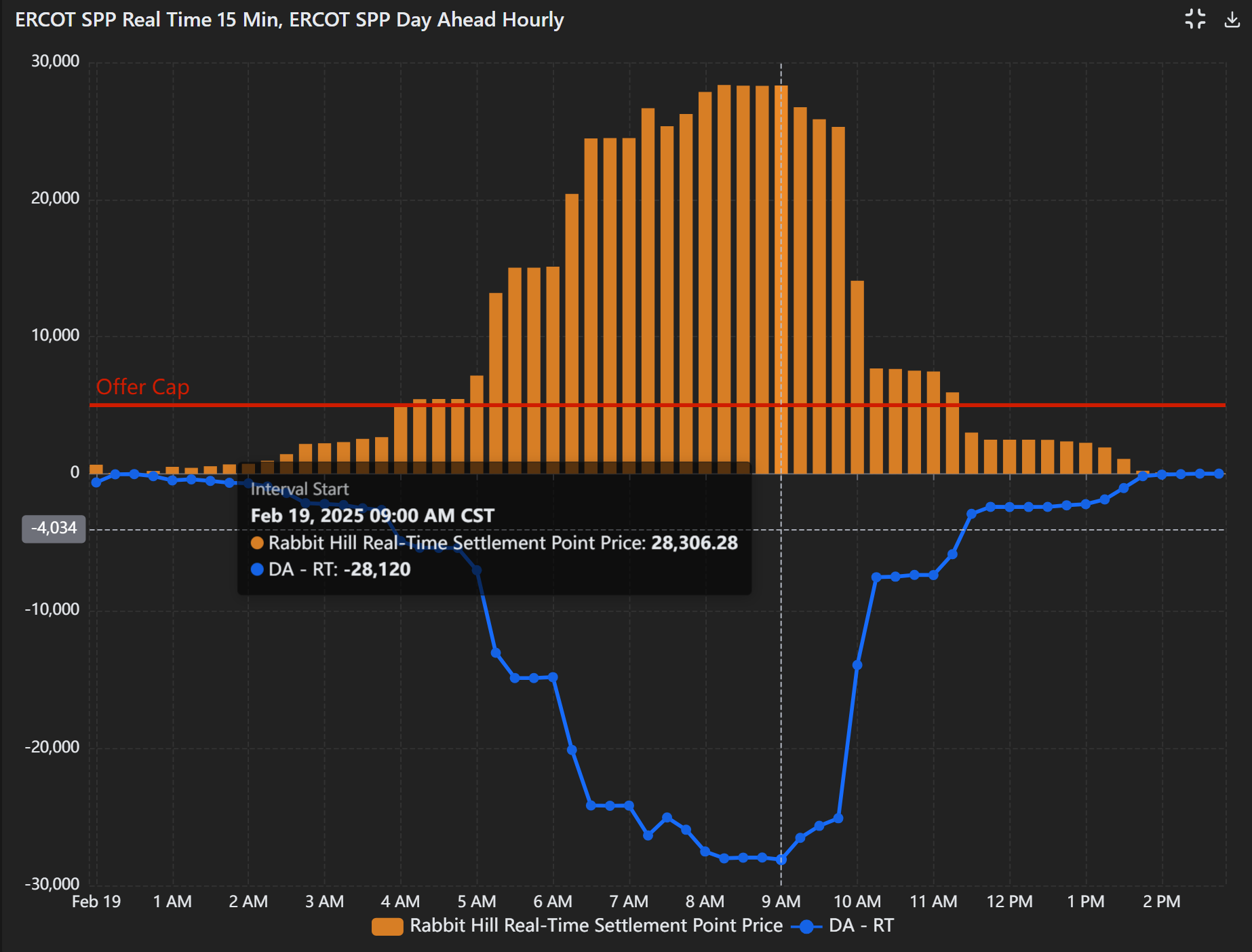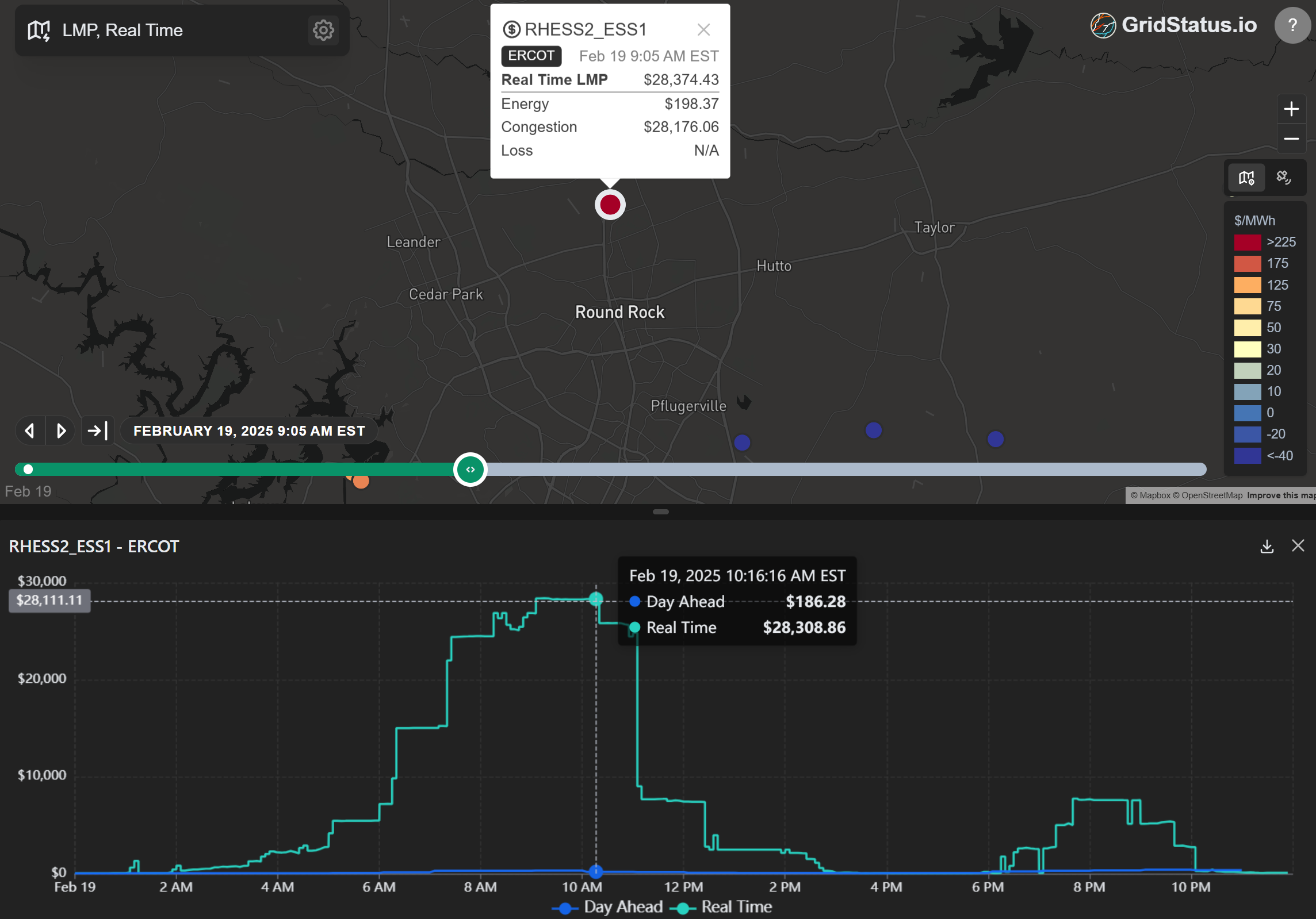 On February 19th, 2025, a single node in ERCOT saw some of the highest prices ever recorded in the market’s history, reaching nearly $30,000/MWh. This location isn’t just home to a handful of buses, but also a battery, leading some observers to speculate about the potentially vast revenue captured by its owners. But did the battery even have charge, and if it did, how much could it output? If it had charge, did it capture the peak? Was it constrained by commitments from the prior day? Now, 60 days later, we can answer these questions.