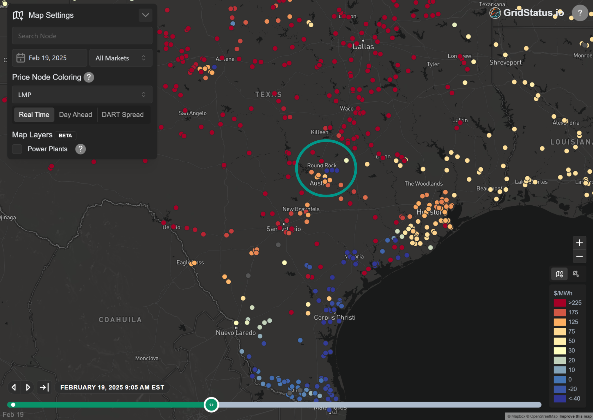 Here, we can turn to the price map set to February 19th set to the time of peak LCRA prices. With some prior knowledge of LCRA's relative territory, the area around Austin looks like a prime suspect due to the mix of high and low prices in close proximity, which can indicate each end of a difficult constraint.