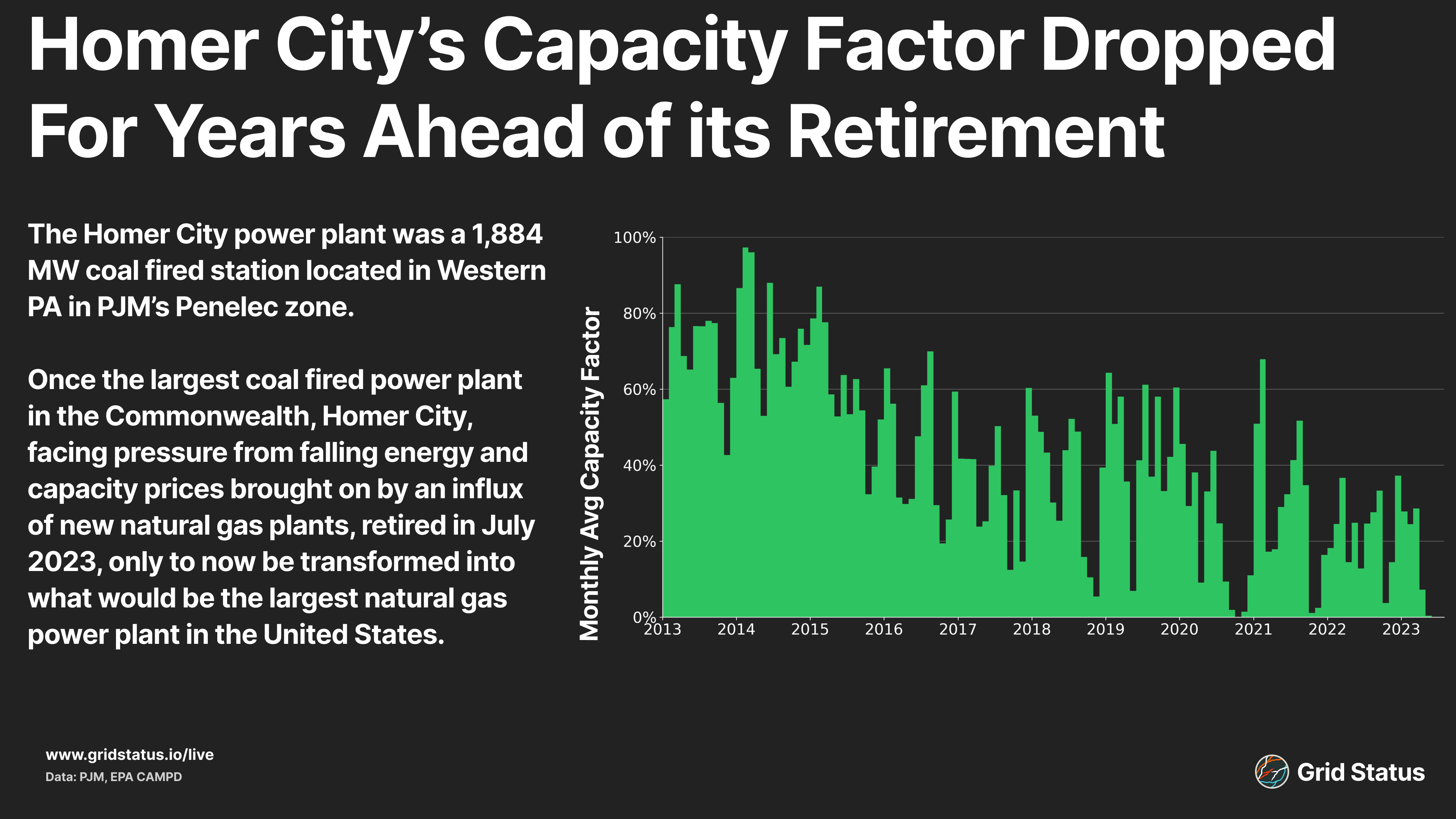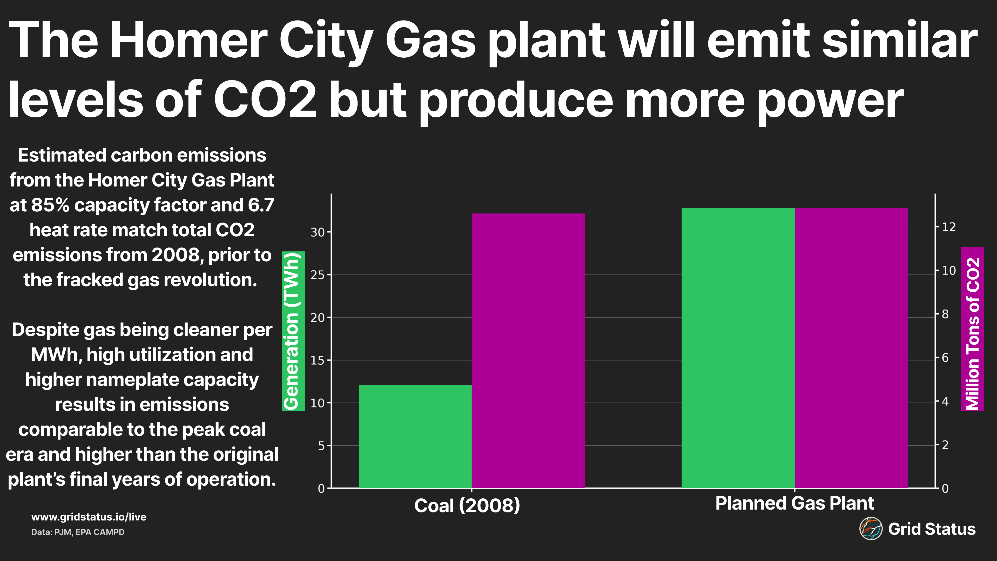 Prior to the shale revolution, Homer City coal ran at a relatively high capacity factor. In 2008, Homer City had a 73% capacity factor with fairly consistent generation across seasons. That higher capacity factor allowed the plant to generate 12.11 TWh, while emitting an estimated 12.6 million tons of CO2. The Homer City Gas plant, with a 4.4 GW nameplate capacity, and running at an estimated 85% capacity factor (in line with both efficient plants but also data center load factors) with a 6.7 heat rate, would produce 32.76 TWh in the same year, emitting slightly more CO2, 12.84 million tons.