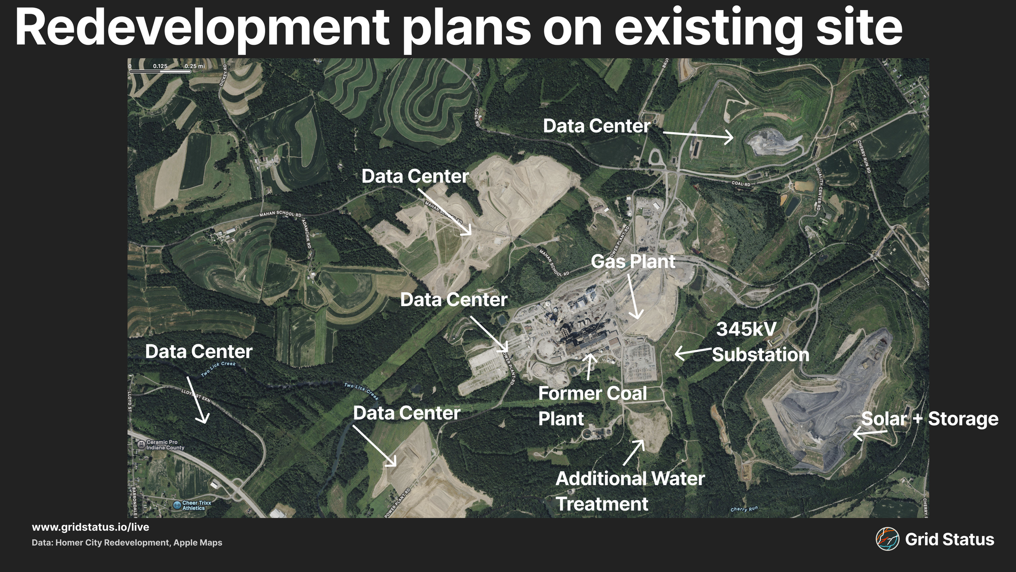 While exact details on project sequencing are scarce, it's likely that construction on the power plant would begin first, while data center construction follows. Based on project renderings, it appears that power infrastructure will be located on or near the site of the previous coal plant, in proximity to the existing on-prem 345kV substation, while data centers would be built out on surrounding parcels of land, presumably already under the control of Homer City.