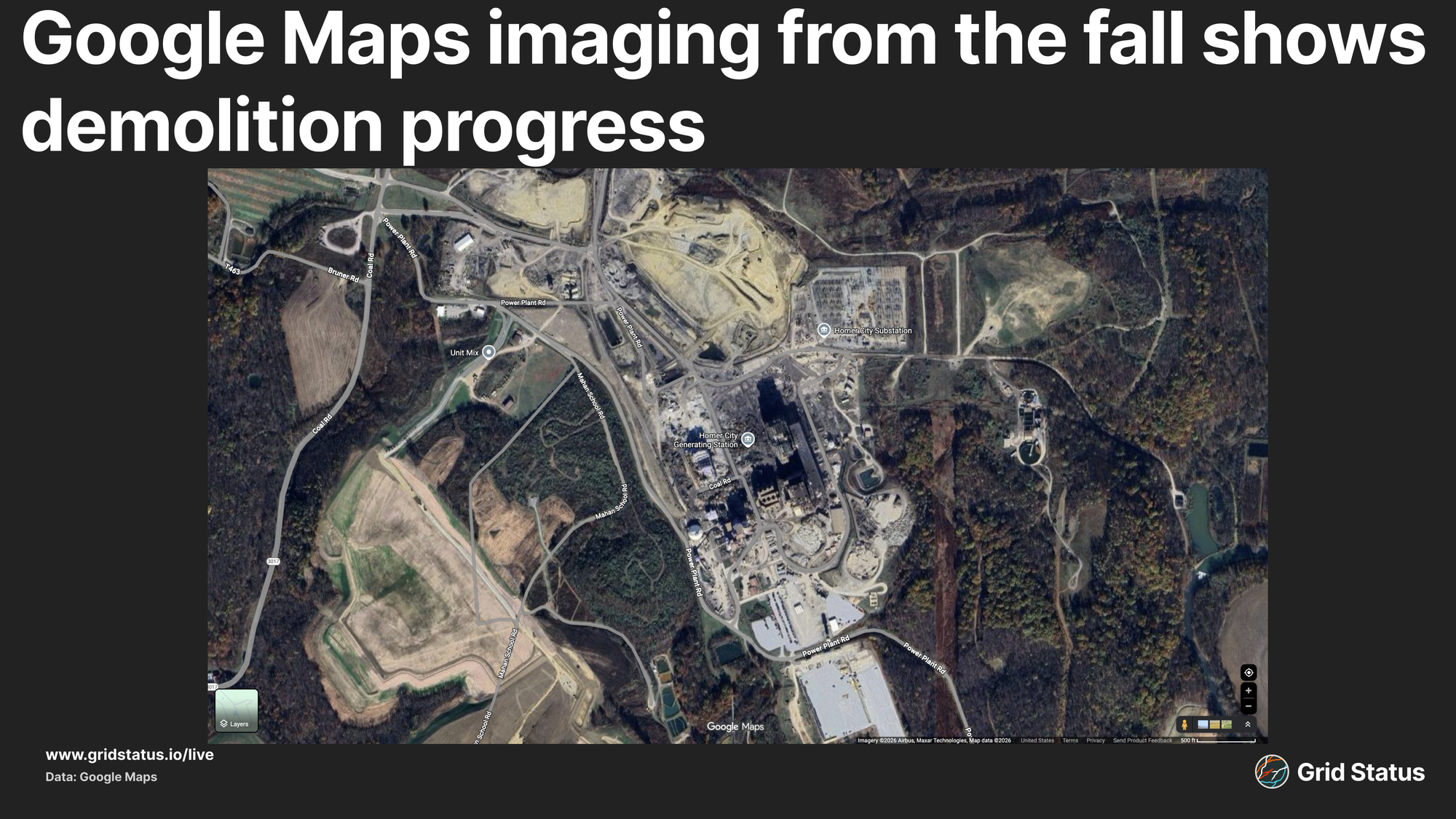 Site work is currently underway, with one of the most dramatic steps taken being the demolition of existing smoke stacks in March 2025, which enabled further remediation of the plant. Satellite imagery from Google Maps shows that work dismantling remnants of the power plant and clearing the ground is underway. Through comparison to public satellite imagery made available by Skyfi, it appears that the Google image was taken sometime in late fall, as Sentinel 2 imaging from late October shows similar levels of ongoing work. Additionally, public documents and confirmation from local Facebook groups show that additional demolition work was taking place as recently as mid-December 2025.