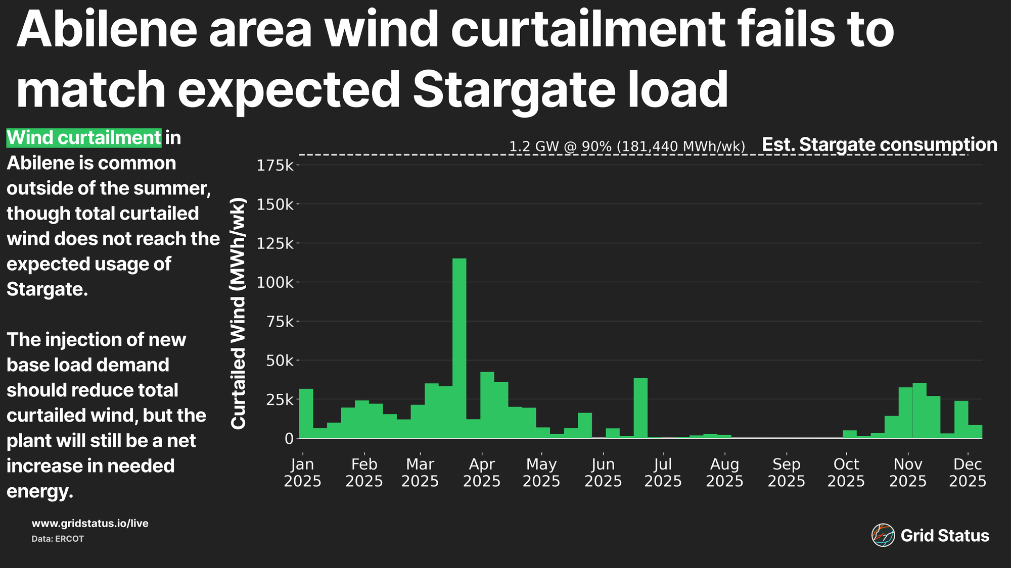 We calculated curtailment data for wind resources located West of Abilene, including multiple units that directly tie onto the same 345kV network that Stargate intends to interconnect to. The data shows that while Crusoe is correct that wind generation in the area does see curtailment, this “wasted” wind energy would not cover the expected usage of the full data center.