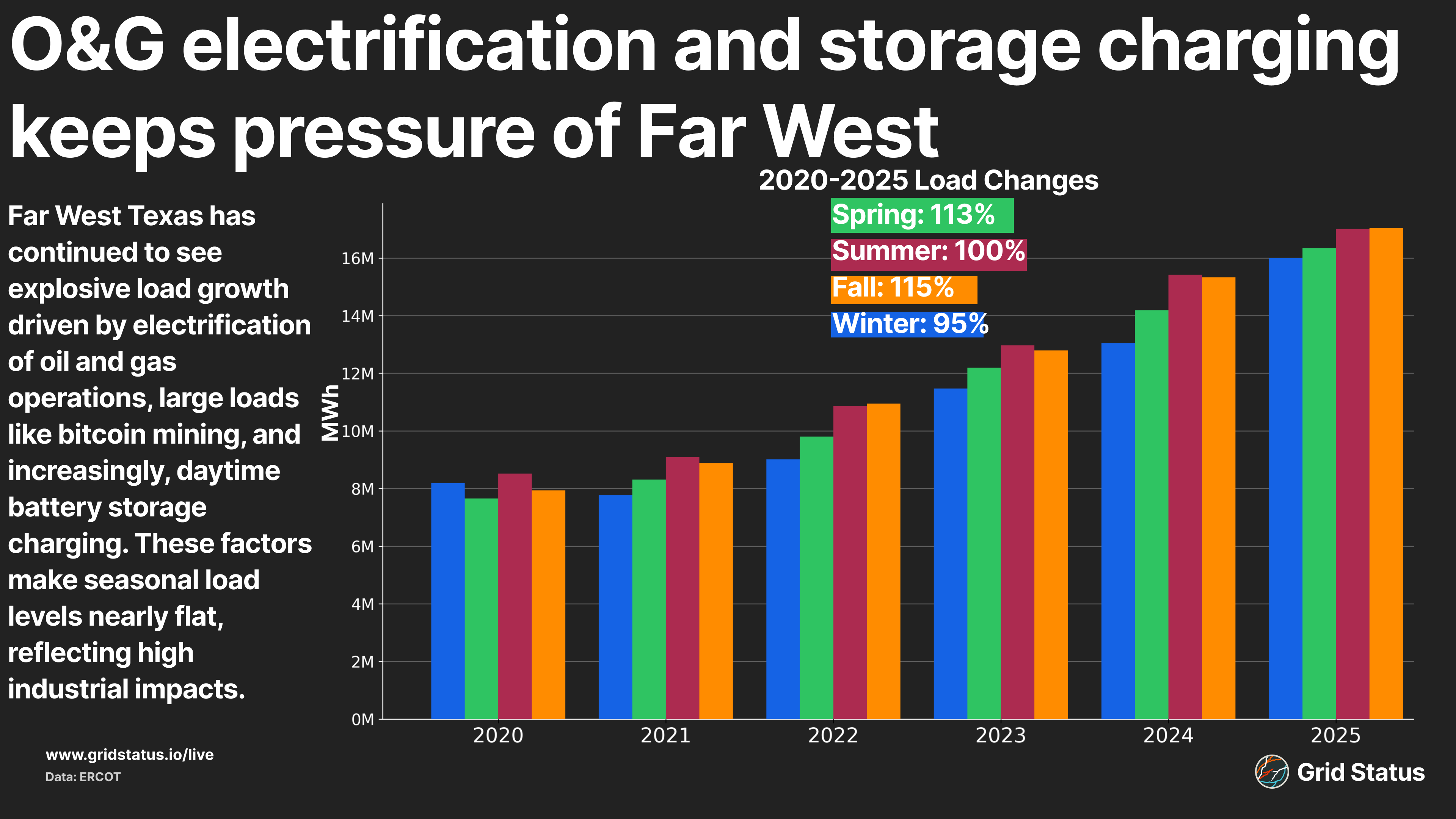 West is a summer peaking region, like the wider ERCOT system, followed by winter, which tends to see spikes driven by a high proportion of electric heating load. While the region still exhibits seasonal load trends, we can compare this pattern to that of the neighboring Far West. Far West, which has limited population centers, has seen load levels explode over recent years.