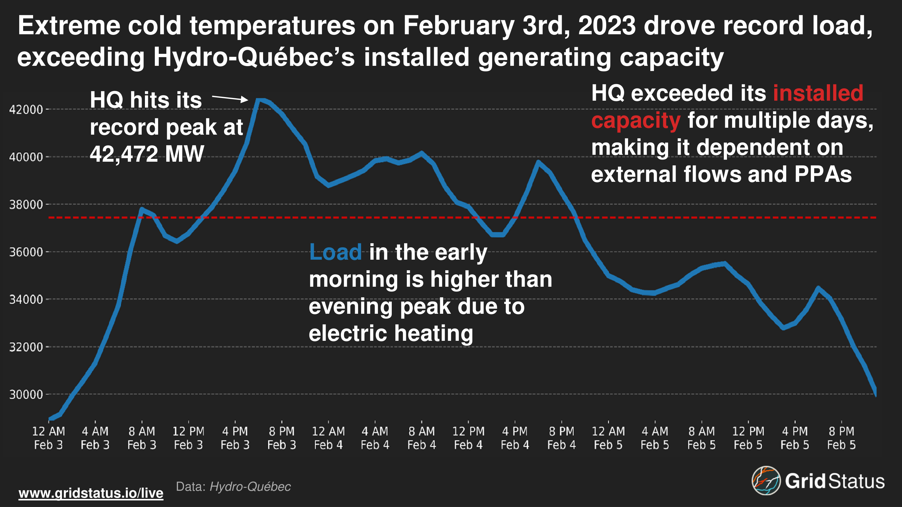 As we have mentioned in prior blogs, electric heating has profound impacts on load in the early morning when temperatures can be coldest. This was seen in Québec when Hydro-Québec exceeded its record peak load on February 3rd, 2023, hitting well over 42.4 GW. Due to the high reliance on electric heat, load levels did subside as the sun rose, but remained close to 40 GW overnight, straining the grid as load exceeded the capacity of HQ’s entire generating fleet.