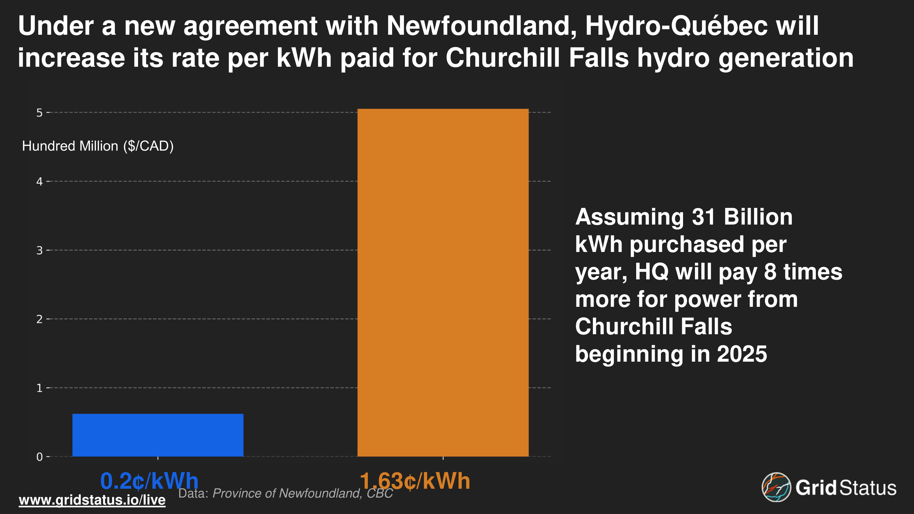 This increase in payments, based on an estimated 31 billion kWh purchased per year, greatly increases revenues for Newfoundland, averaging over a billion dollars per year by the time the new contract expires in 2041.