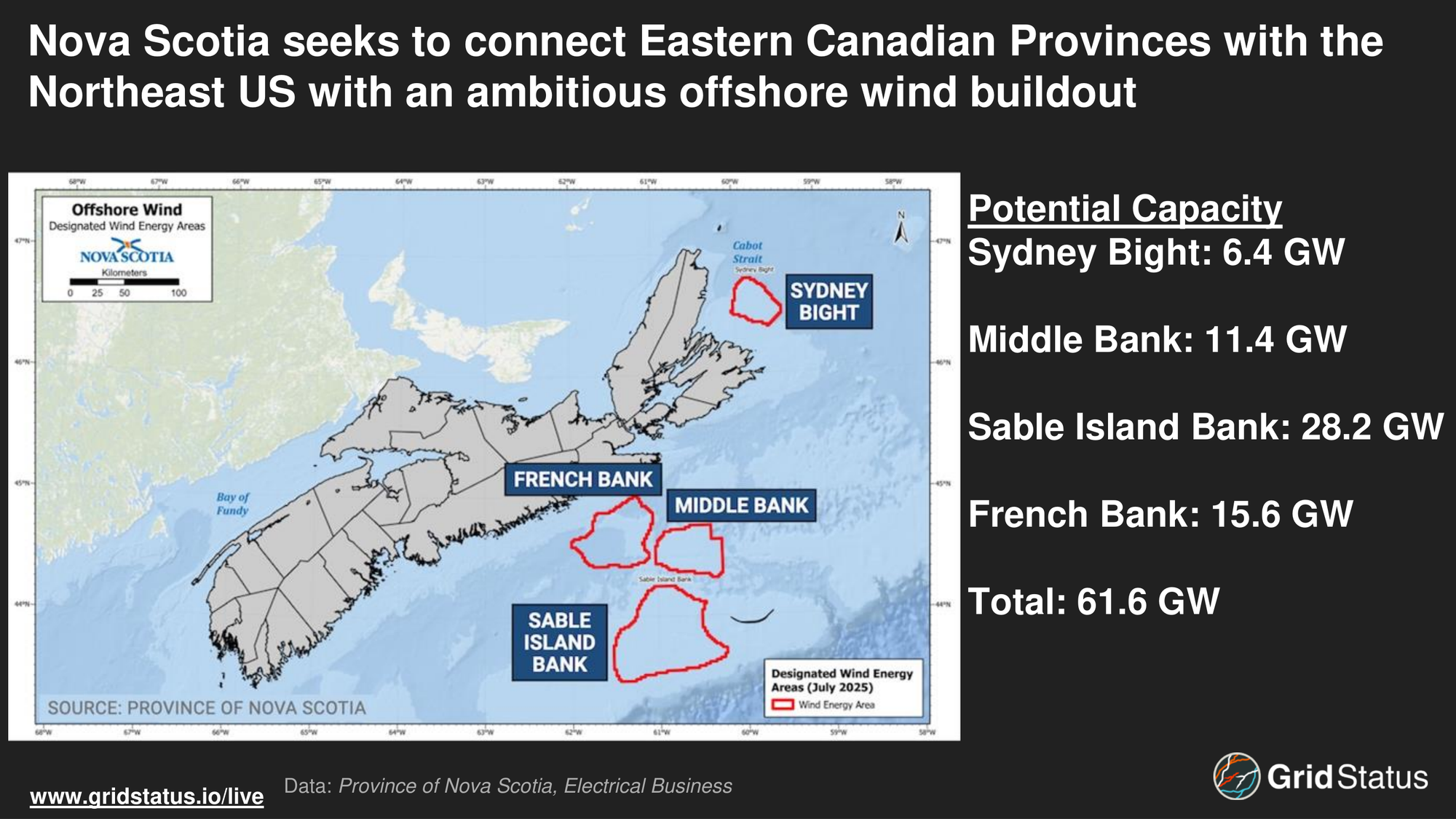 While historically Québec and Ontario have been the provinces of choice for powering the Northeast, New England is already looking elsewhere for future ties with Canada. Nova Scotia Premier Tim Houston has laid out an ambitious offshore wind project, the first in Canadian history, known as Wind West. While the first iteration of the project calls for an already ambitious 5 GW of offshore wind development, in a region where load peaked at a little over 2 GW in 2024, project aspirations envision over 60 GW of wind capacity in some of the highest wind speeds in the world, averaging 10.3 m/s at 100M hub heights.