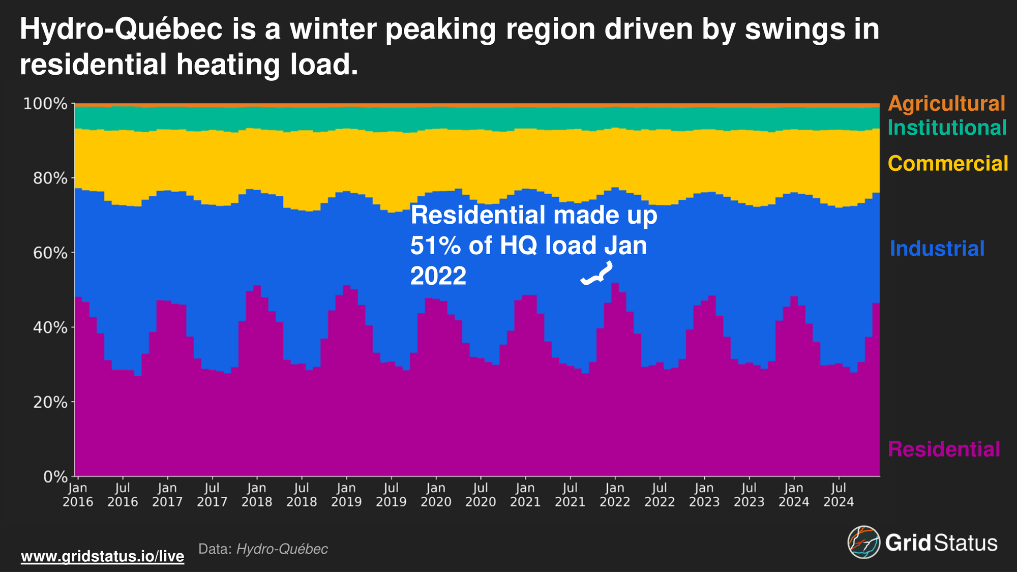 Québec’s fuel mix allows the utility to have some of the lowest and most stable utility rates in North America. In a 2024 report, HQ compared its residential and industrial rates to those of other major North American cities. Residential consumers, on average, paid 8.05 cents (CAD) per kWh, three times less than in Chicago, whereas large consumers paid 5.74 cents per kWh, half of the rate in Chicago. This cheap power and the regional climate have even influenced Québec’s load curve.