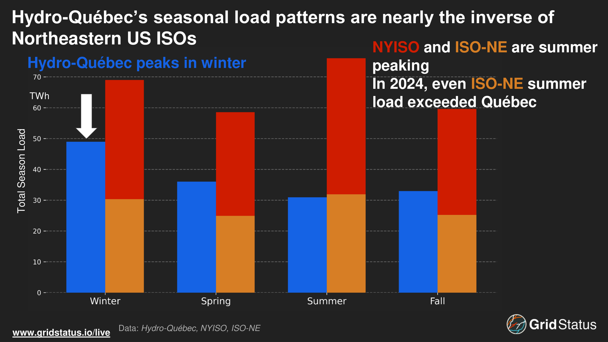 By achieving a high level of renewable generation and heating, Québec has already met many of the decarbonization goals that its neighbors, New York and New England, have yet to achieve. The impact of this was clear in 2024 when winter load levels were nearly 20 TWh higher than the summer, the opposite of nearby ISOs like ISO-NE and NYISO.
